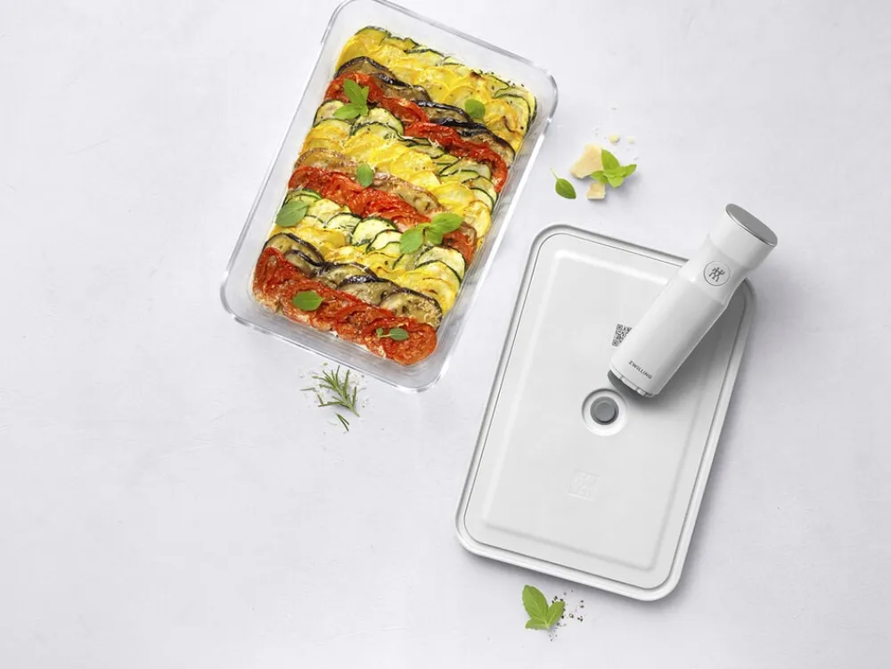ZWILLING FRESH & SAVE er et vakuumopbevaringssystem, der holder maden frisk op til 5x længere. Opbevaringssystemet bibeholder vigtige nærdingsstoffer og vitaminer i den opbevarede mad. Nu har du muligheden for at komme i gang med at foodpreppe, minimere madspild, og i det hele taget at optimere måden at gemme råvarer på. Ovnfast uden låg op til 180 °C. Fryseegnet indtil -20 °C. Egnet til mikrobølgeovn og opvaskemaskine. Rumindhold: 2,85 L, kan fyldes op til 2,2 L for at kunne vakuumeres. Materialer: Borosilikatglas (beholder), BPA fri plast (låg), silikone (ventil, tætning). Vakuumlåg med innovativ dobbelt forseglingsteknologi. Enkel registrering med den gratis app der vha. QR koden holder styr på holdbarhed og indhold. Forhindrer frostskader på madvarer. Holder maden friskere i op til 5 gange længere tid, sammenlignet med andre opbevaringsmetoder uden brug af vakuum.Vakuumopbevaring bibeholder vigtige vitaminer samt næringsstoffer i den opbevarede mad. Kom nemt i gang med at foodpreppe med FRESH & SAVE, nu er det muligt at tilberede mad til flere dage på én gang.
