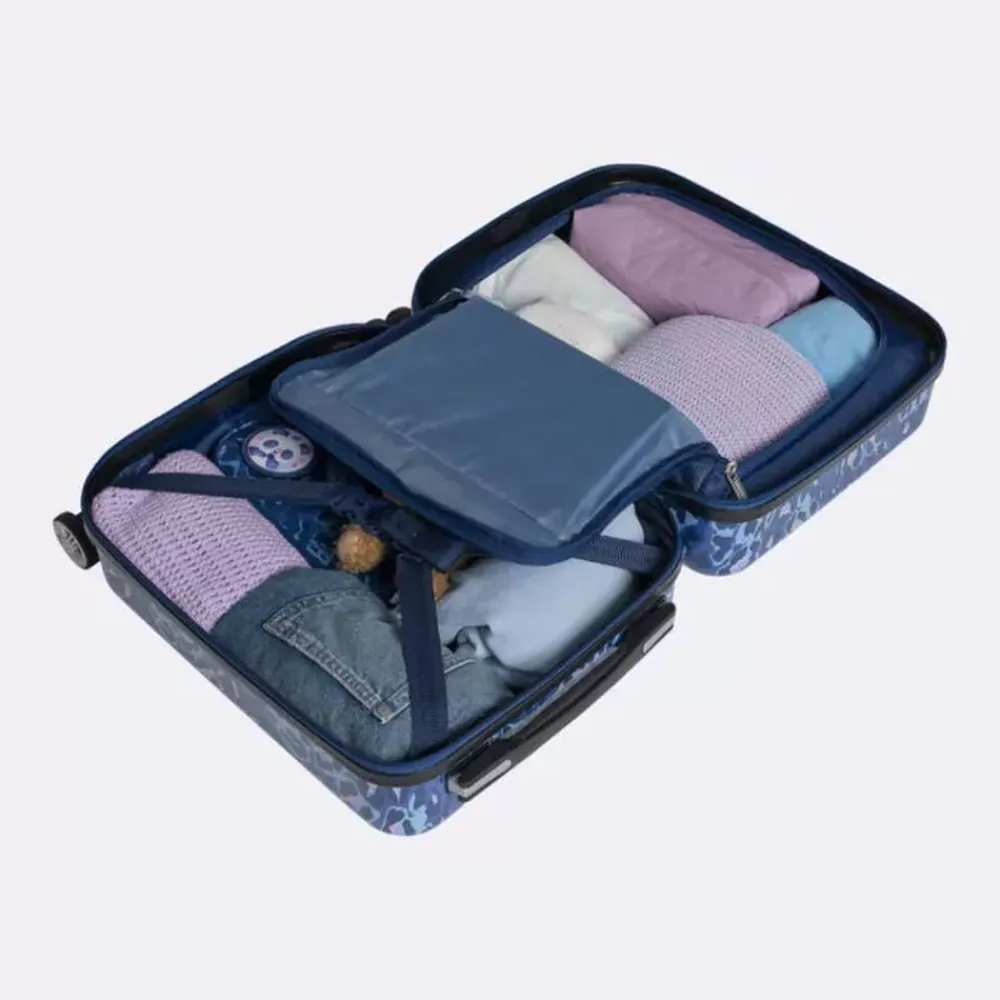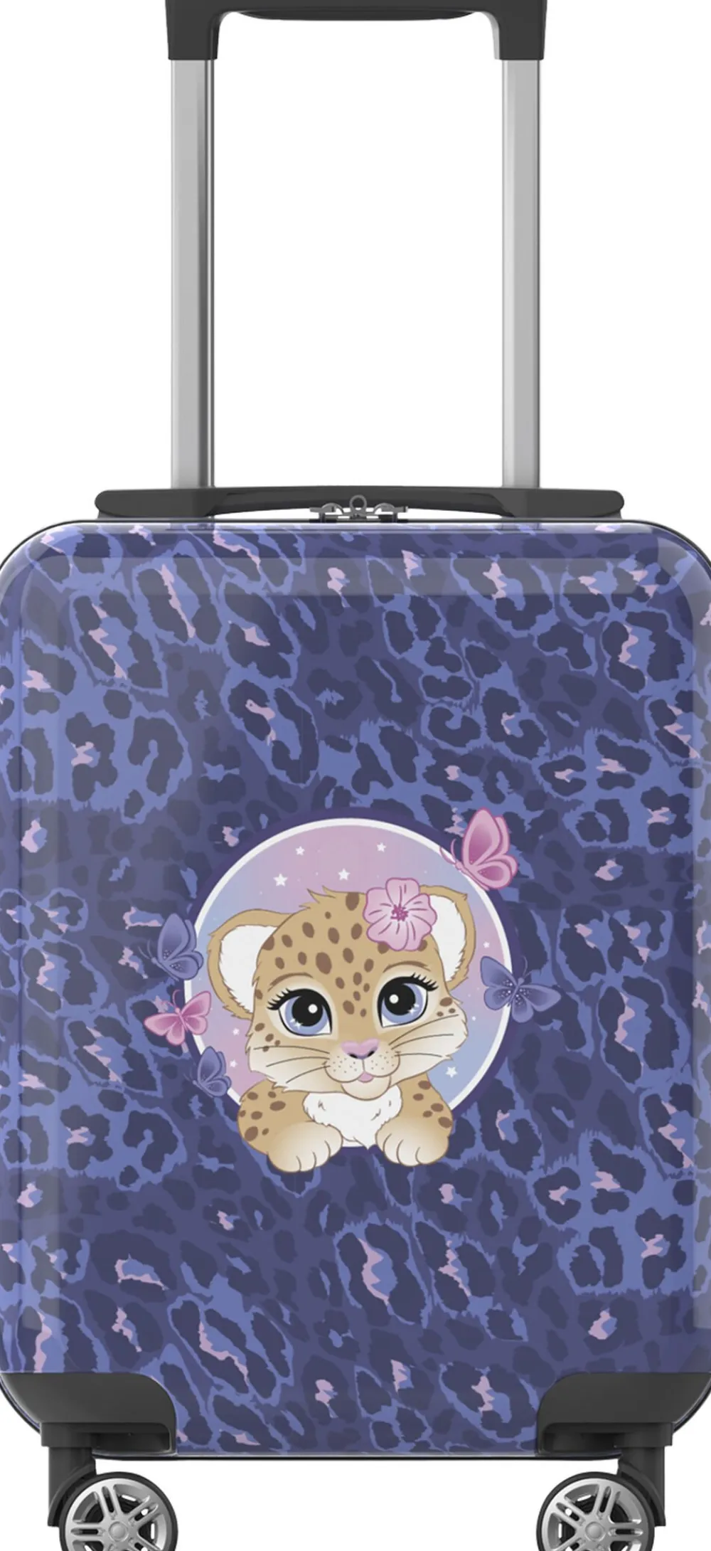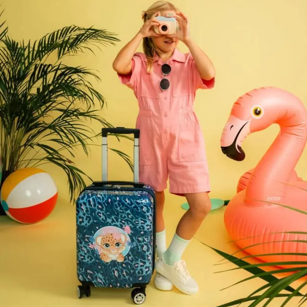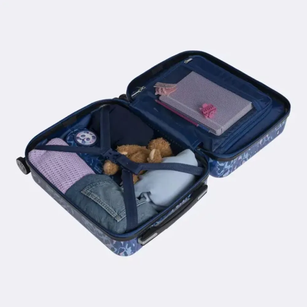 Det er stort at få sin første kuffert! Vores børnekuffert har et magisk design, som virkelig skiller sig ud i mængden. Målene på kufferten tilfredsstiller kravene for håndbagage/kabinekuffert hos SAS og Norwegian. Børnekufferten har 4 dobbelte, stærke og stillegående 360°-spinnerhjul, som gør den let at trille. Med lynlåse i god kvalitet holdes dine ejendele trygge under rejsen. Helforet inderside, opdelt med netlomme, pakkestropper i bunden og et adskilt rum i låget. Integreret teleskophåndtag aflaster arm og skulder for unødig tyngde.