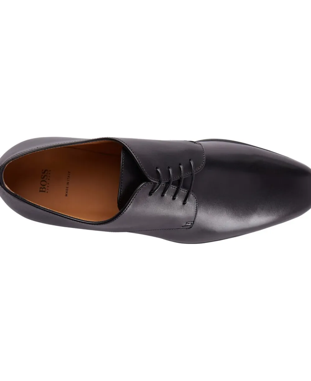 Klassisk herresko fra Hugo Boss i ægte læder produceret i Italien. Skoen har runde snørebånd på fronten og en lettere spids snude samt en lille hæl. Som tilbehør får man opbevaringsposer med. En klassisk sko af høj kvalitet til de finere begivenheder.