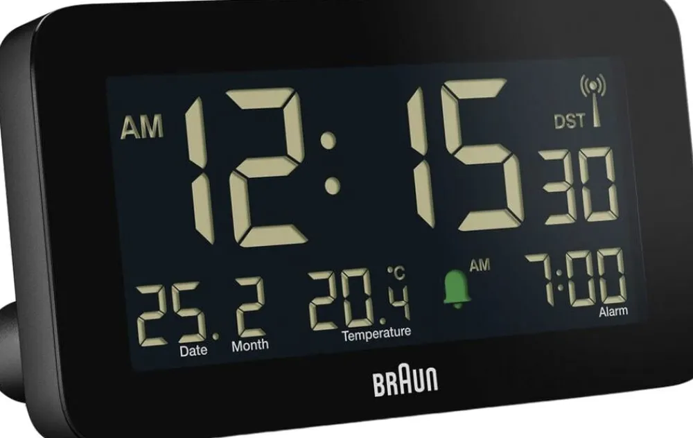 Dette digitale vækkeur fra Braun har et negativt LCD-display med en baggrundsbelysningsfunktion, der oplyser displayet, når det er i et miljø med svagt lys, for at maksimere læsbarheden om natten. Den har en DCF-signal radiostyret funktion til centraleuropæisk tidszone, hvilket sikrer ultimativ nøjagtighed til enhver tid. BC10-DCF kan indstilles til enten 12 eller 24 timers tilstand og viser klokkeslæt (med sekunder), dato og måned, temperatur og alarmtid.