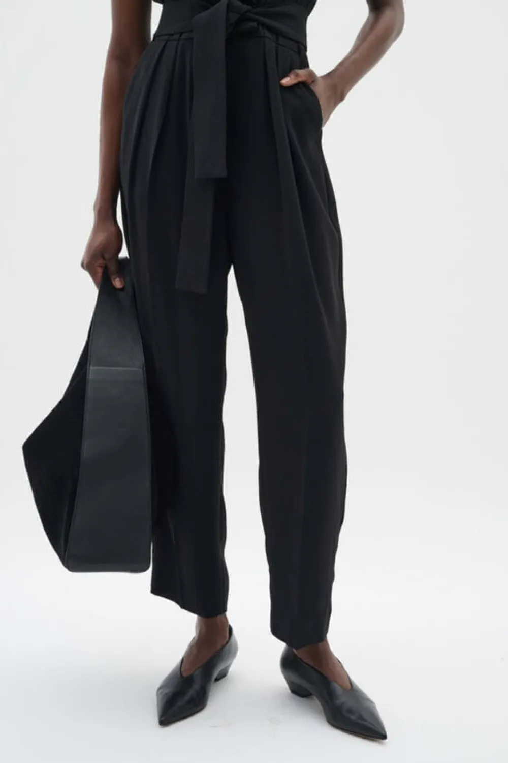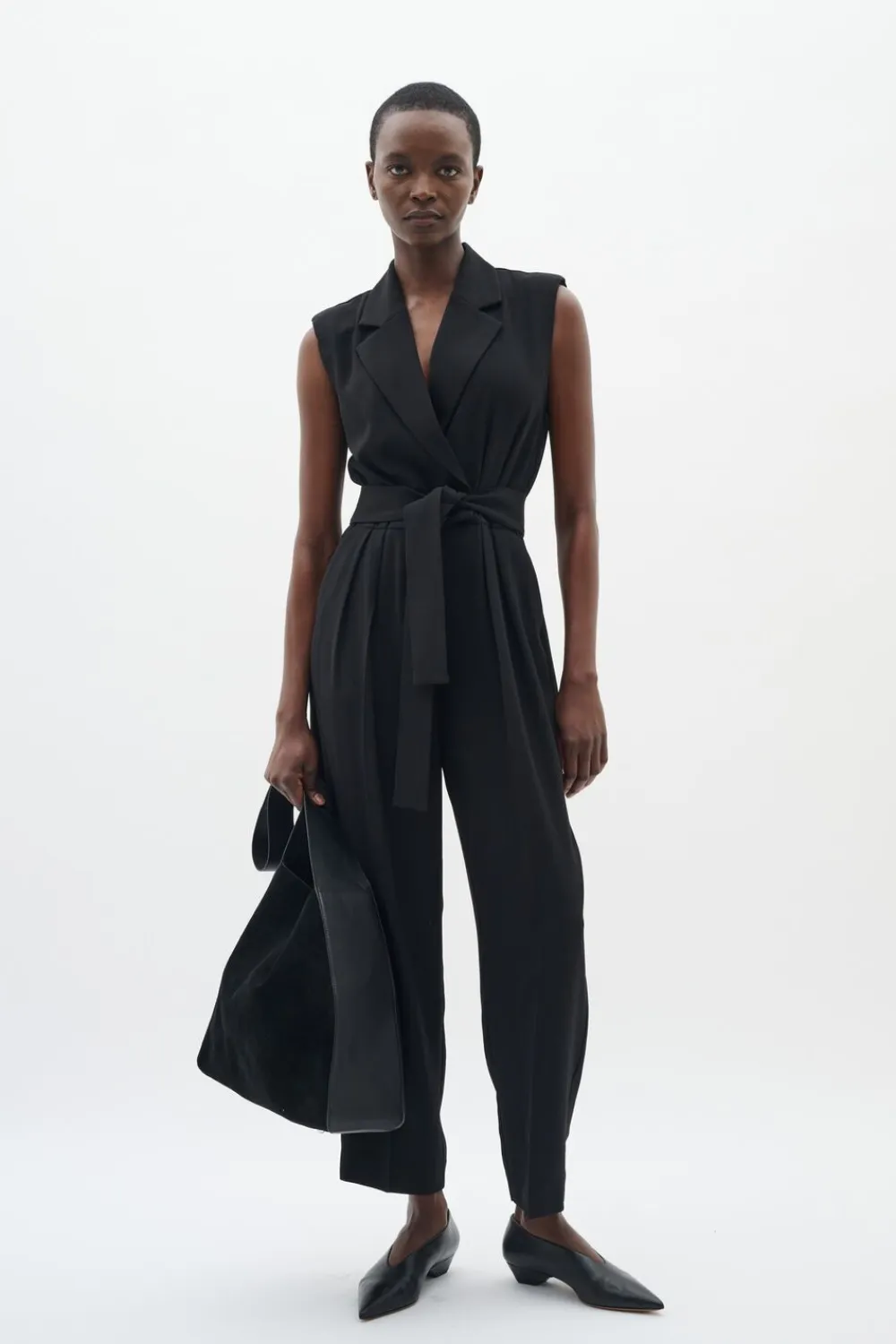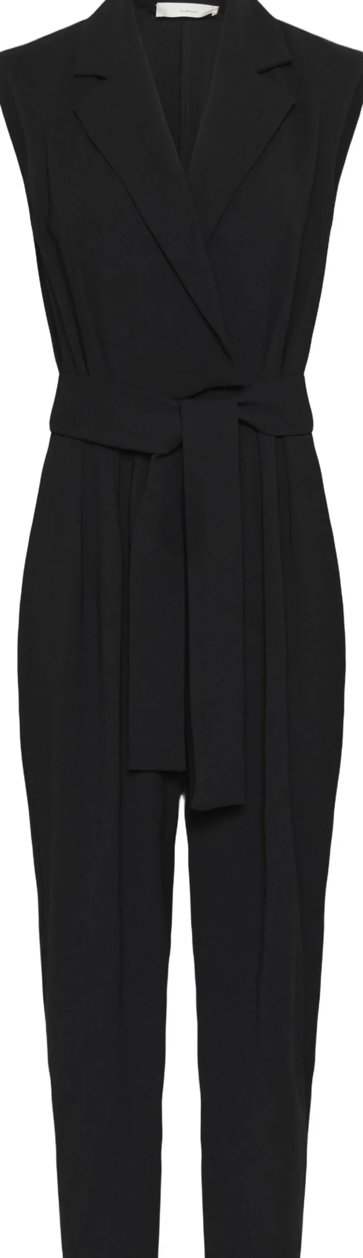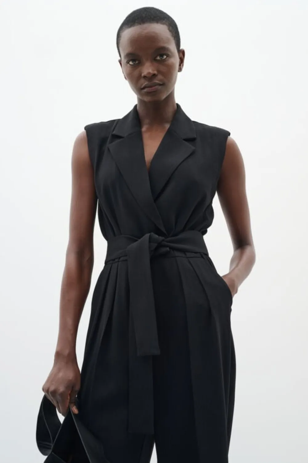 Ærmeløs buksedragt med figursyet pasform, reverskrave og bindebælte i taljen. De smalle ben og det enkle snit giver et moderne og elegant udtryk, perfekt til både arbejde og særlige lejligheder.