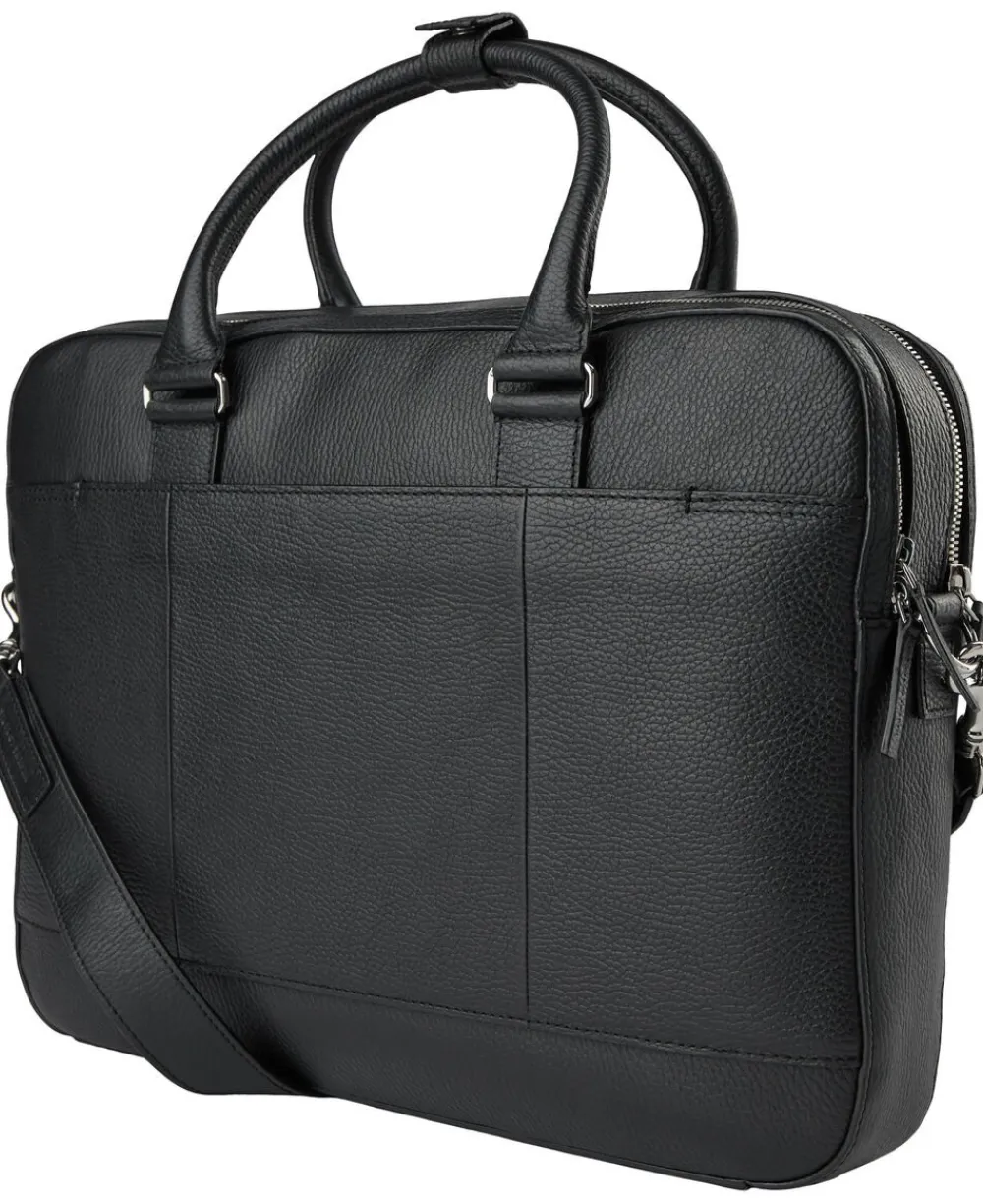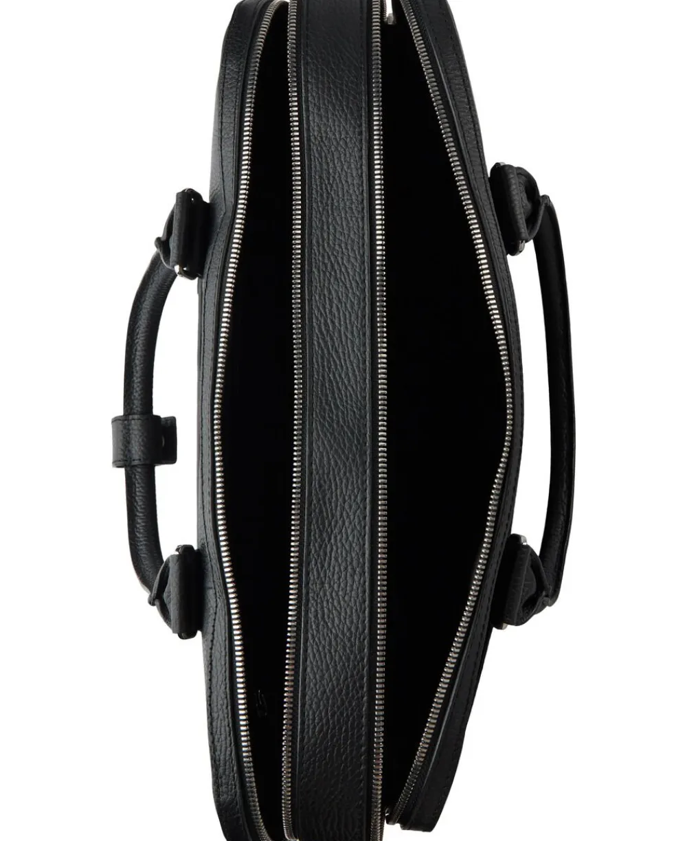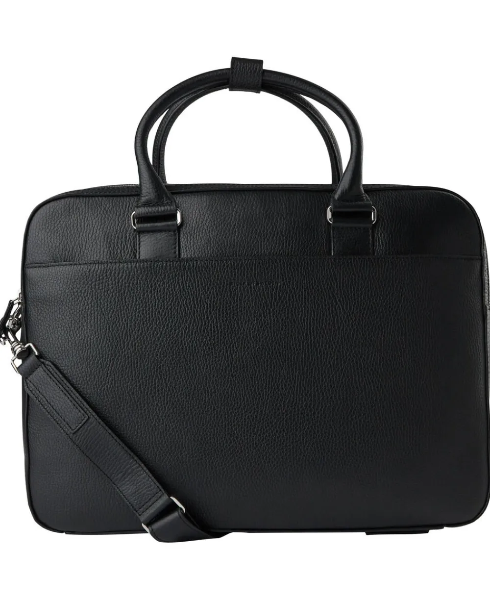 Briefcase in soft grainy leather. Two main zipped compartments. Concealed zipped pocket at the front. Trolley attachment strap at the back. Inside features one zipped pocket, two open welt pockets, one card slot, two pen slots. Detachable shoulder strap. Embossed Tiger of Sweden logo at front. Size: 29 x 40 x 7.5 cm. Fits a 15″” laptop