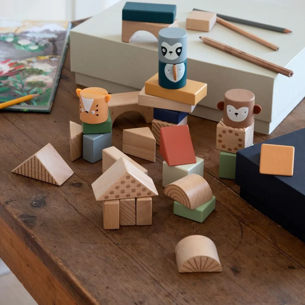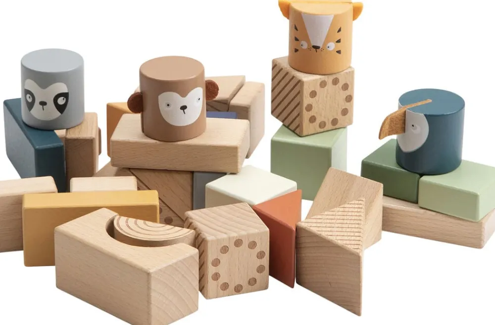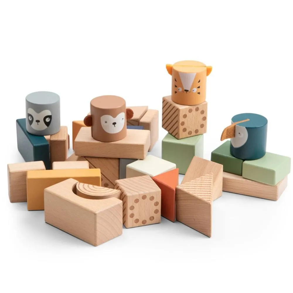 Klodserne er dekoreret med farver og mønstrer og sammen med de fire dyrehoveder – aben Maci, tigeren Tupi, tukanen Tully og dovendyret Lacey giver det barnet mulighed for at bygge totempæle, en zoologisk have, en dyreindhegning eller noget helt andet. Lad barnets kreativitet udfolde sig, og se hvordan simple træklodser kan blive til mange timers god leg og underholdning.