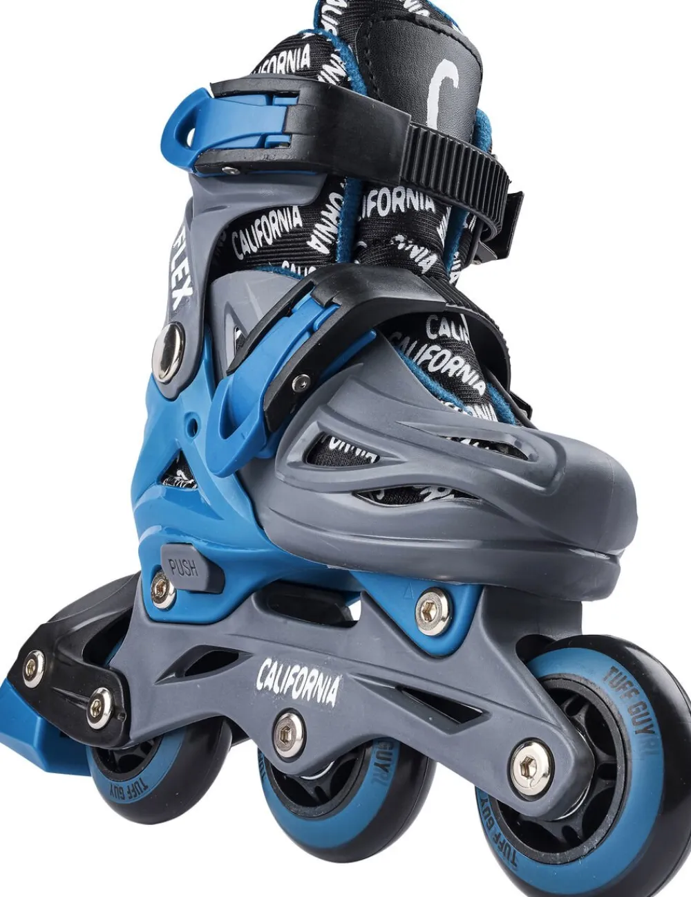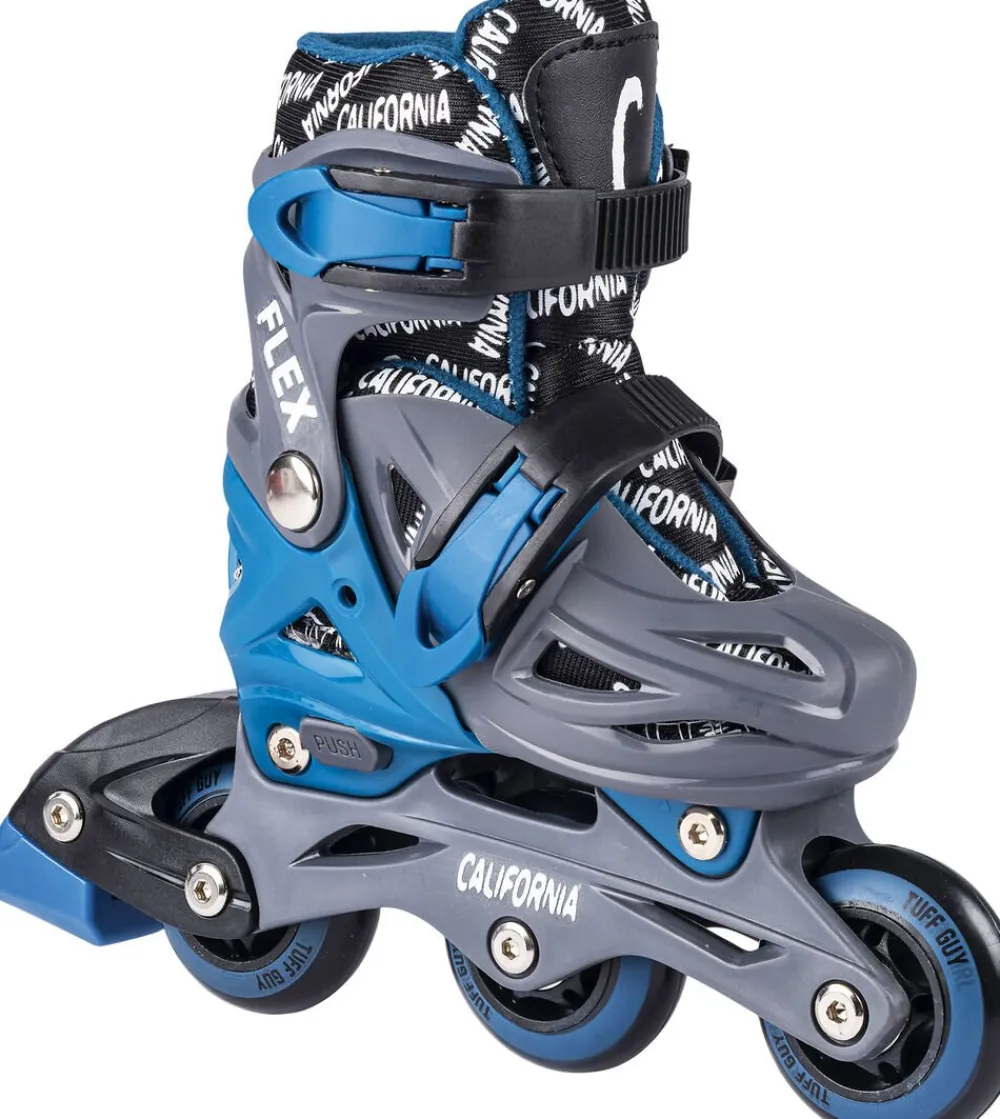 California TUFF GUY 2-i-1 inliners Fleksible inliners der kan justeres i størrelserne 27-30, 31-34 eller 35-38 Specifikationer: Str 27-30 kan ændres fra inliners til 3-hjulet Str 31-34 og 35-38 kan ændres fra inliners til side-by-side Dobbeltsidede spænder Støbte plasthjul 608z kuglelejer Bremseklods på én støvle 4 størrelser pr skøjte