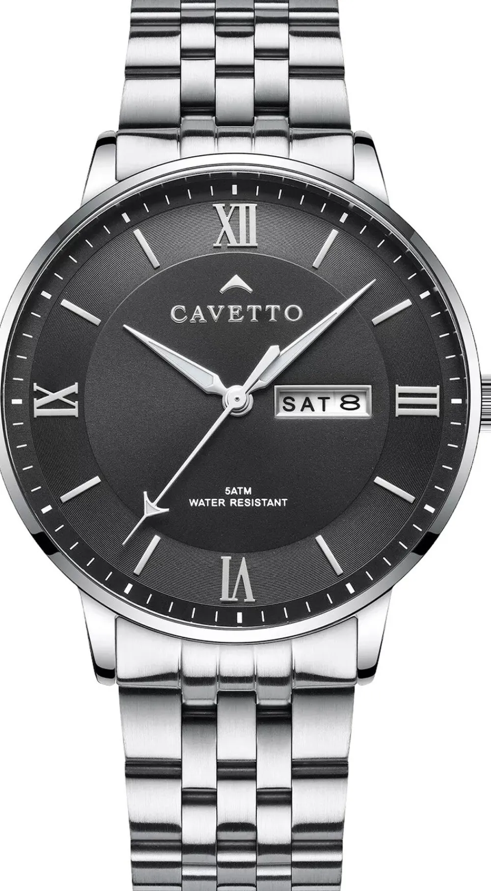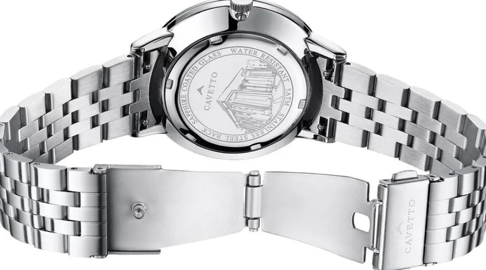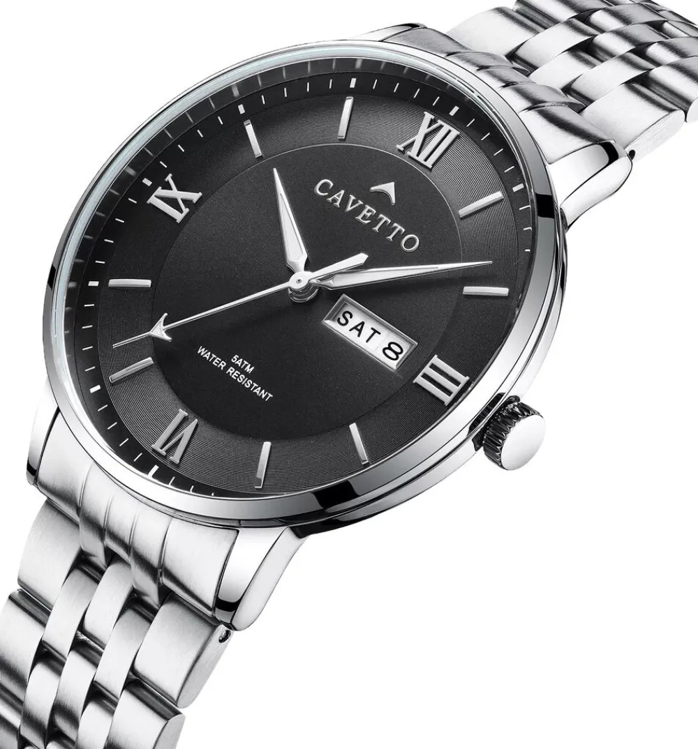 Cavetto Classic CV0045 uret har en rund urkasse med en ren bezel, der giver et tidløst look. Urskiven er enkel og har romertal og slanke timemarkører, der tilføjer et klassisk præg. Dag- og datovisningen er pænt integreret og giver både stil og funktionalitet. En stål-lænke fuldender designet og giver det et klassisk udseende, der passer til enhver lejlighed.