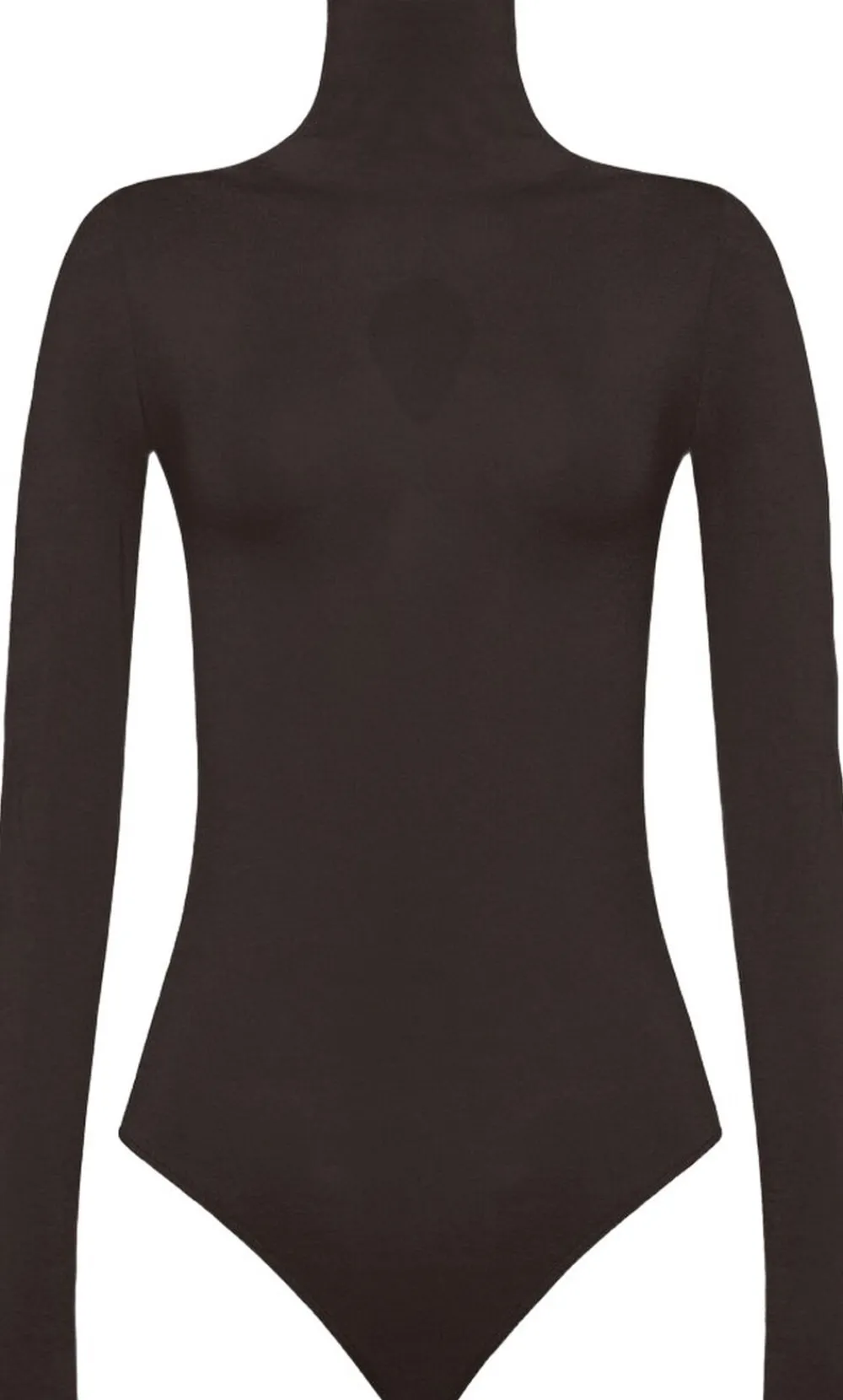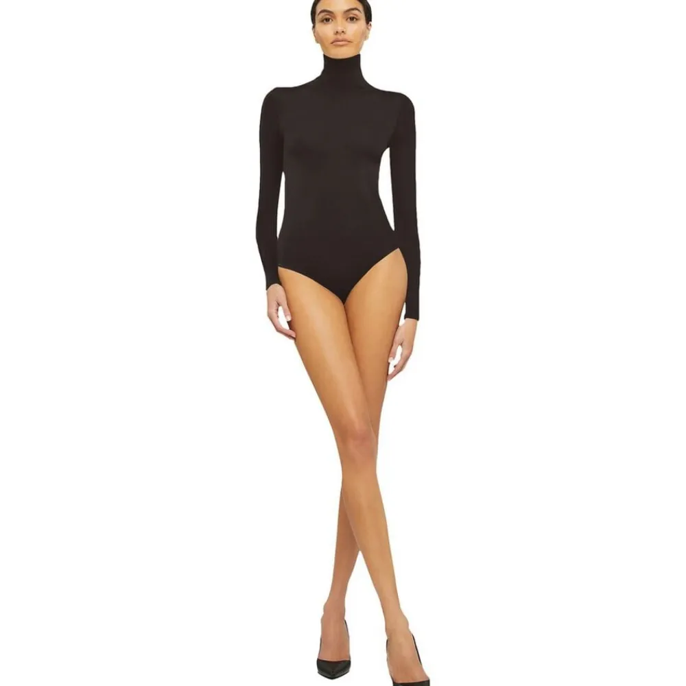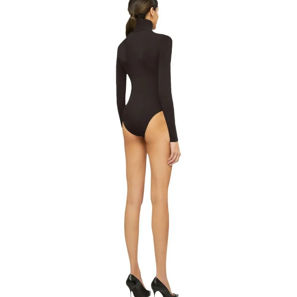 Colorado bodystocking med turtleneck. Vores bodystocking i uigennemsigtigt, strikket materiale med en skinnende finish. Den har en strikket rullekrave og lange ærmer for en elegant silhuet. En brasiliansk snit forneden fuldender den slanke pasform. Ikonisk, uigennemsigtigt, naturligt, cirkelformet strik