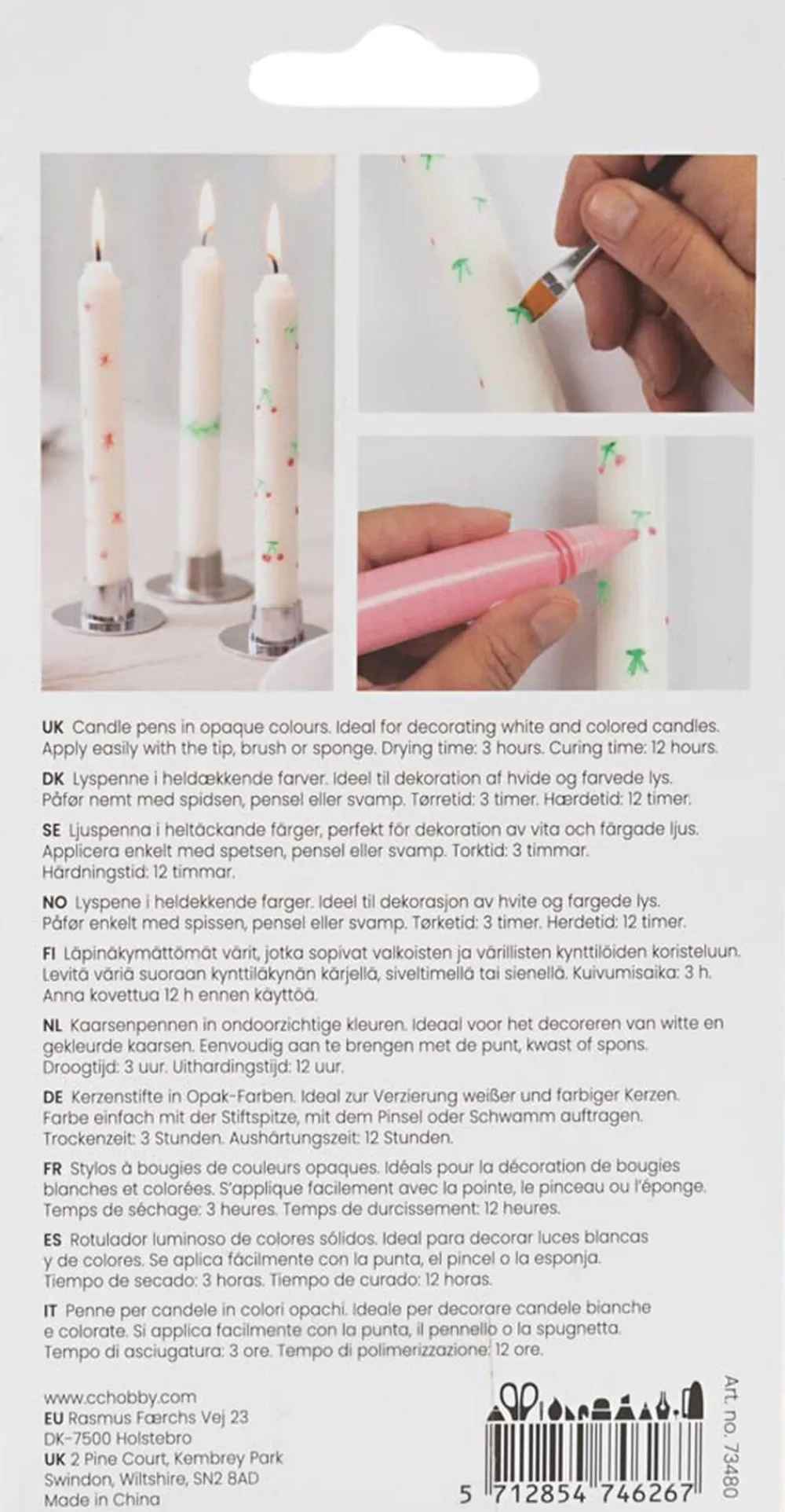 Flotte, heldækkende farver i paraffinvoks, som du nemt kan dekorere dine støbte lys med. Dekorer fx med ord, tal, mønstre og tegninger. Påfør nemt med spidsen, pensel eller svamp. Tørretid: 3 timer. Hærdetid: 12 timer. Med disse lyspenne kan du nemt lave dine egne, unikke stearinlys. Brug farverne på lys, der allerede er støbt, og dekorer dem fx med ord, tal, mønstre eller fine tegninger. Påfør farven direkte med pennens spids eller brug blot en pensel eller svamp. Overfladen tørrer på 3 timer og hærder efter 12 timer. Hvis du vil fjerne voksen, skal du gøre det med en fugtig papirserviet, mens voksen stadig er våd. Du kan også gnubbe voksen af, når den er tør.