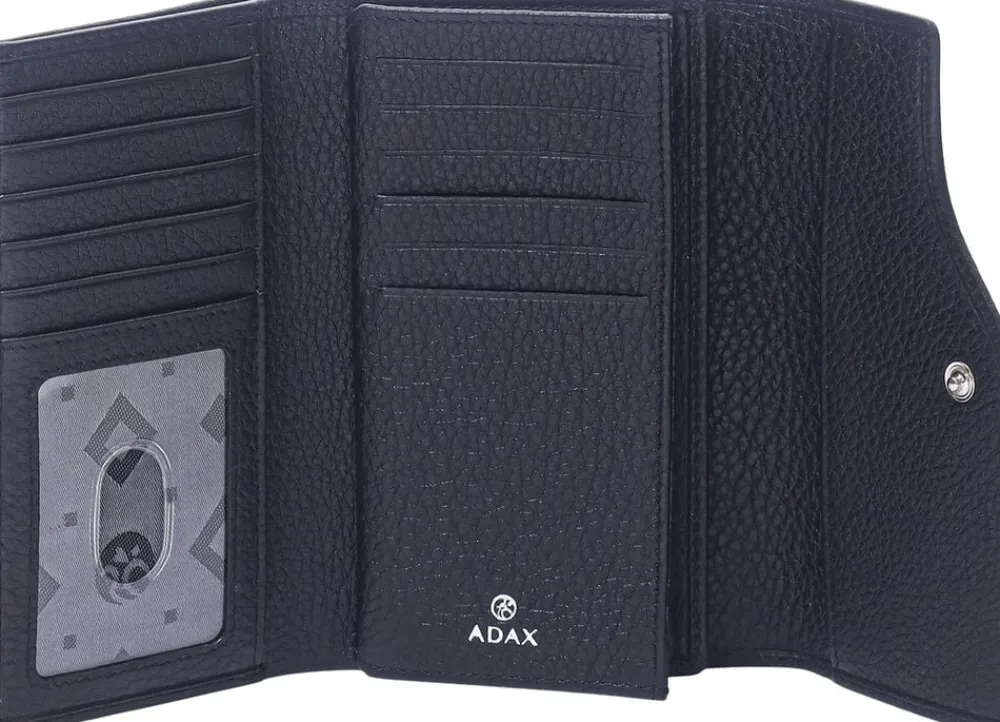 Marianna pung i Cormorano skind fra Adax. Pungen lukkes med en trykknap under den asymetriske klap. Inden i er der 11 kortlommer samt plastrude til fx kørekort, yderligere er der 2 rum til sedler og diverse. Der er en lomme med plads til mønter der lukkes med lynlås. På bagsiden af pungen er der også en lynlåslomme. Pungen har RFID beskyttelse.