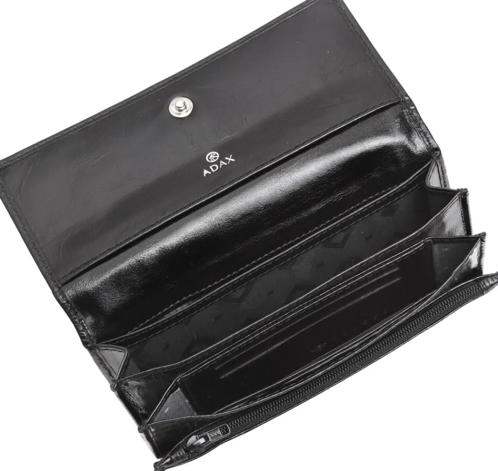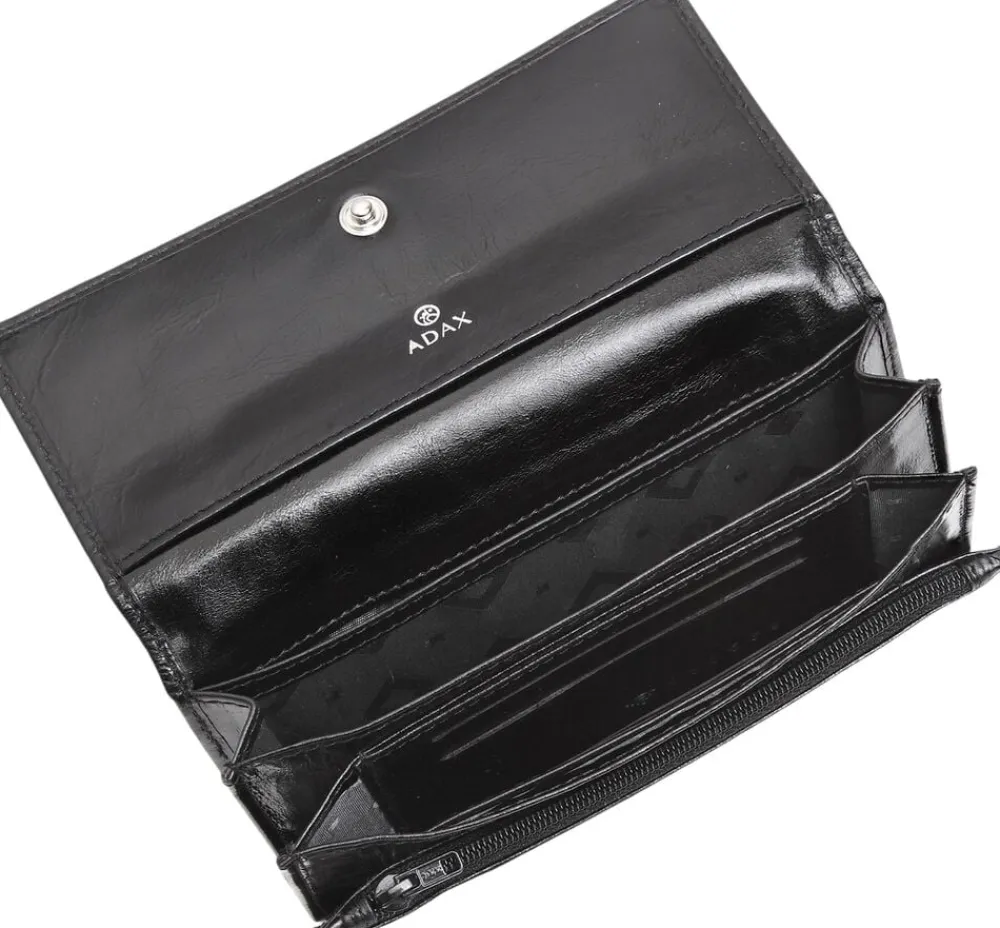 Nete pung i Salerno kalveskind. Pungen har et lille åbent rum på bagsiden af klappen, der lukkes med en trykknap. Inden i er der et stort åbent rum og flere mindre rum, og der er plads til 6 kort samt en lynlåslomme. På bagsiden af pungen er der yderligere en lynlåslomme. Vi anbefaler Adax læderbalsam samt Adax protectionsspray til denne pung.