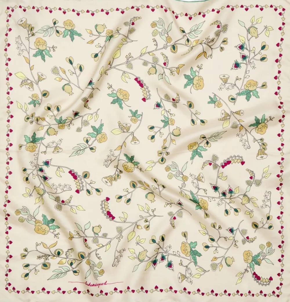 Fairygard Sia Scarf designet af Becksöndergaard er lavet af 100% silke og måler 65 x 65 cm. Tørklædet har et smukt blomstermønster og tilføjer et elegant touch til ethvert outfit. Perfekt til at fuldende dit look, uanset om det bæres om halsen, i bæltestroppen eller som pynt på din taske.