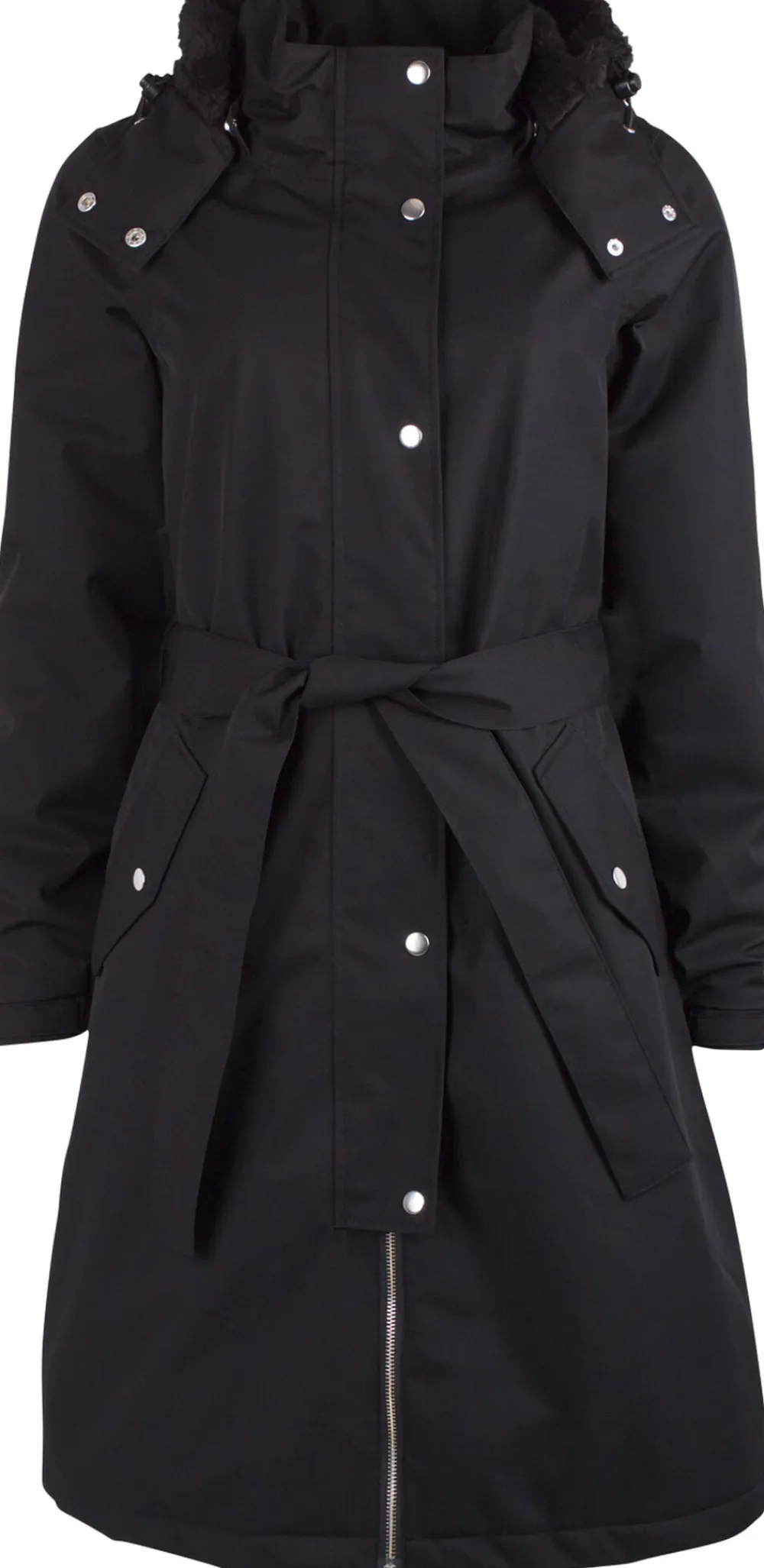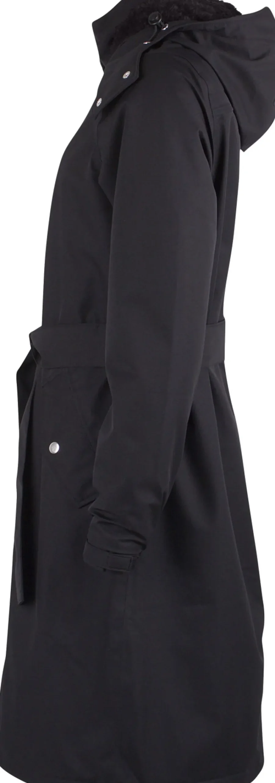 Bornholm er en ny flot foret regnfrakke, der er perfekt til kolde våde vinterdage. Regnfrakken er lavet i den flotte farve sort og er en lidt længere model med bindebælte til at markere taljen. Regnfrakken har aftagelig hætte og indeni er den foret med et skønt mørkt fuzzyfor ved bryst, ryg og i hætten. Foran har regnfrakken to skrålommer, der lukkes med trykknapper og skjult lynlås. Sølvfarvede trykknapper og ved håndleddet er der velcro til at justere for perfekt pasform. Bagpå har jakken forneden tre trykknapper i sølv. Regnfrakken har et søjletryk på 8.000 mm, hvilket betyder den er meget vandtæt, og har tapede sømme. En helt igennem lækker foret regnjakke, der er både er til at ånde i men også at holde sig tør i. Flourfri coating (Bionic Finish), åndbar og vindtæt.
