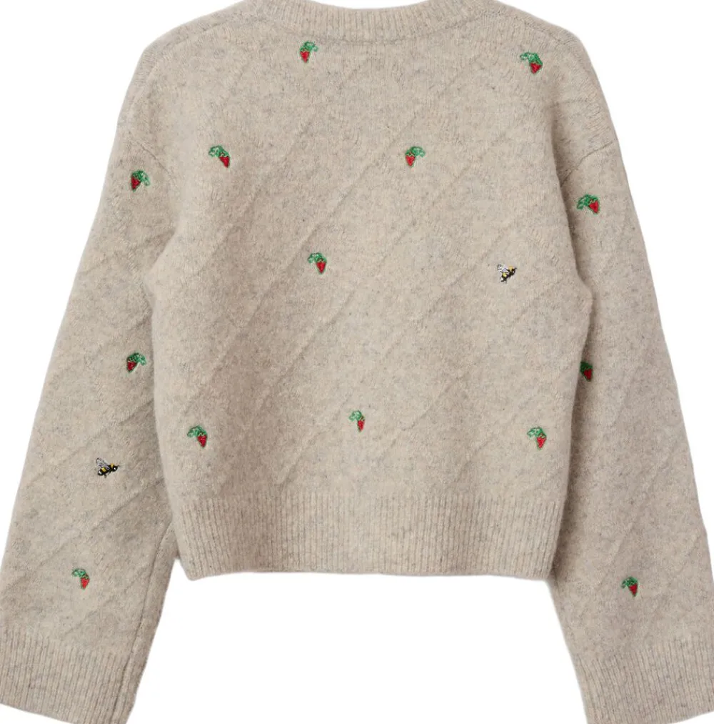 Maja Cardigan er den perfekte signatur cardigan, dekoreret med små jordbærbroderier, der indfanger essensen af Helmstedt. Den lukkes med knapper i en farve, der matcher tekstilet. Med sin perfekte pasform og behagelige følelse supplerer den ethvert outfit