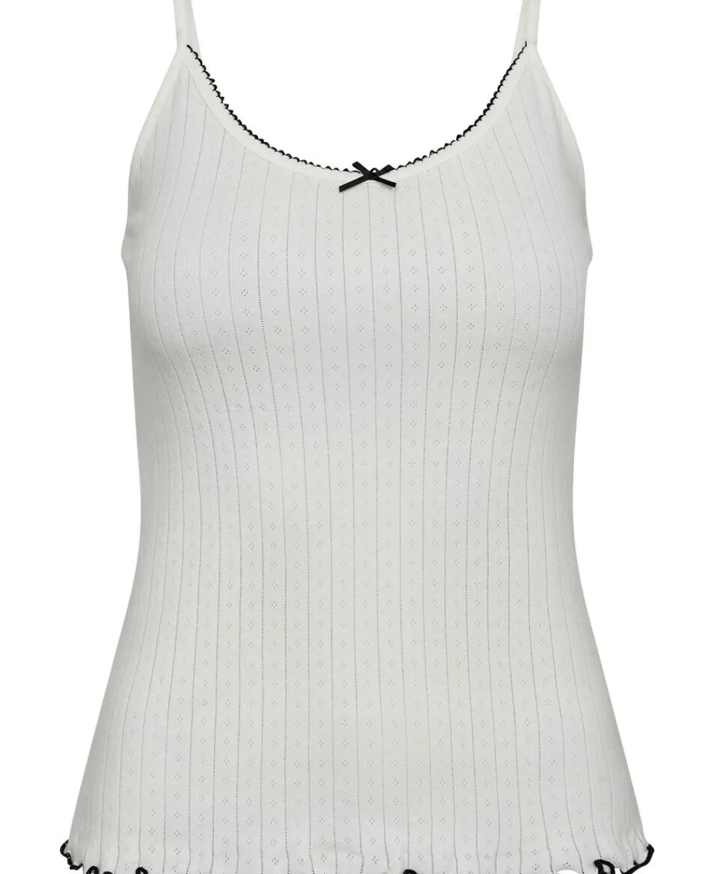Top fra Magasin du Nord Collection i den blødeste kvalitet af 100% økologisk bomuld med GOTS-certificering. Toppen er enkel i modellen med et fint mønster, smalle skulderstropper, rib og blondekant i den runde halsudskæring samt elegante bølgekanter i bunden. En skøn top i den lækreste kvalitet.