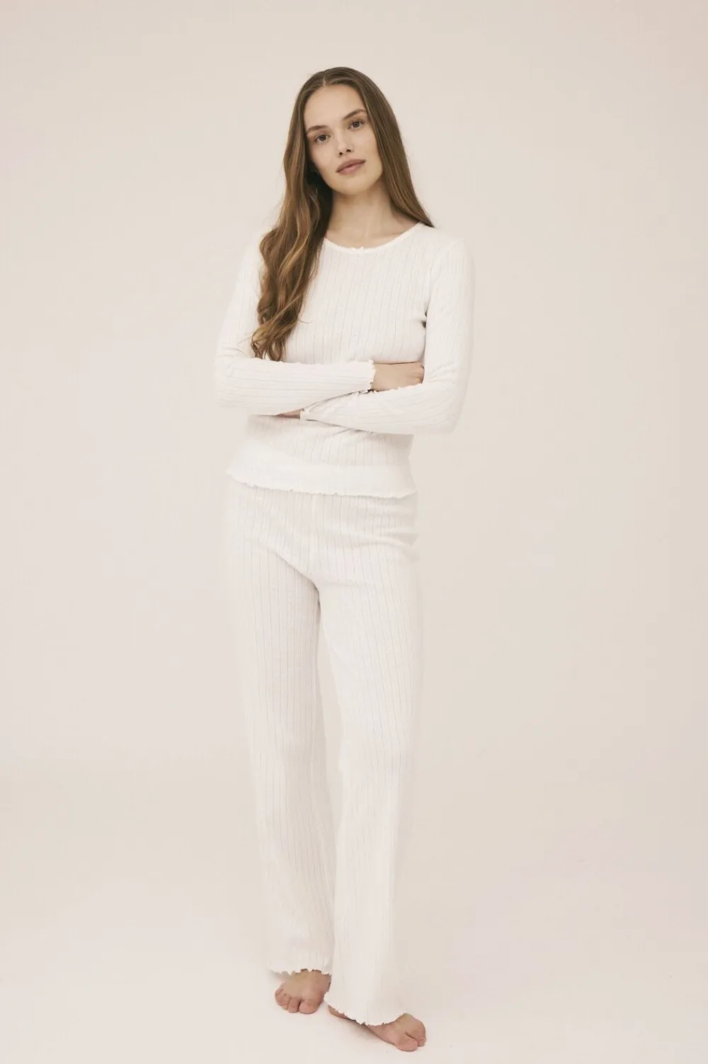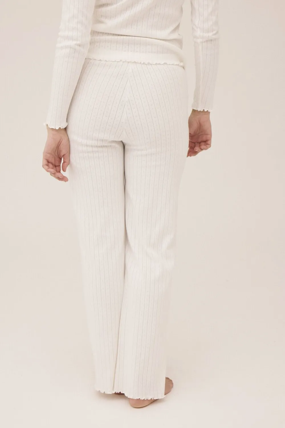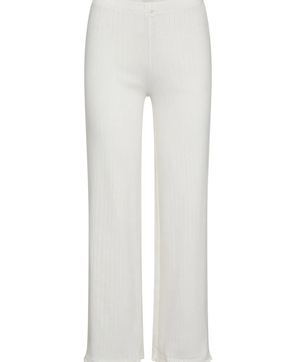 Bukser fra Magasin du Nord Collection i den blødeste kvalitet af 100% økologisk bomuld med GOTS-certificering. Bukserne er enkle i modellen med det fineste hulmønster, sløjfedetalje, bølgekant i bunden samt en smal elastik i taljen. Et par komfortable bukser i den lækreste kvalitet.