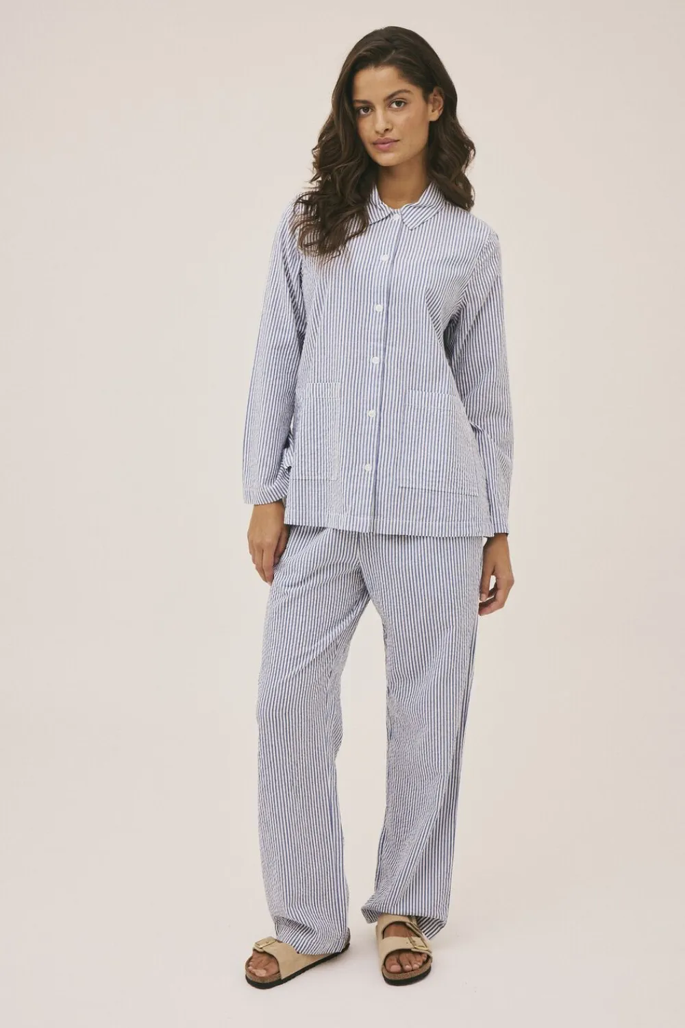 Skjorte fra Magasin du Nord Collection i den blødeste kvalitet af 100% økologisk bomuld med GOTS-certificering. Skjorten har det fineste, stribede print, lange ærmer, knaplukning, frontlommer, slidser i siden samt en vid pasform. En skøn skjorte i den lækreste kvalitet.