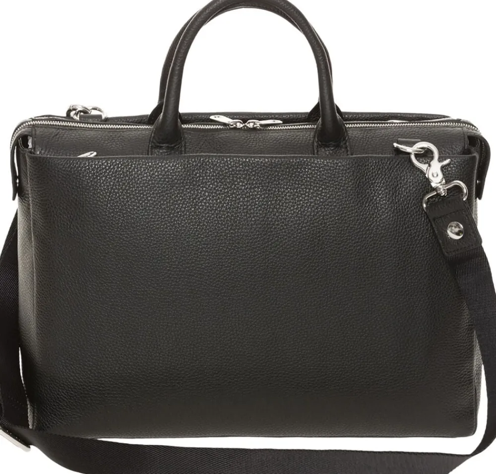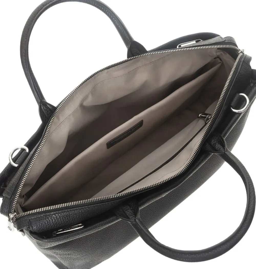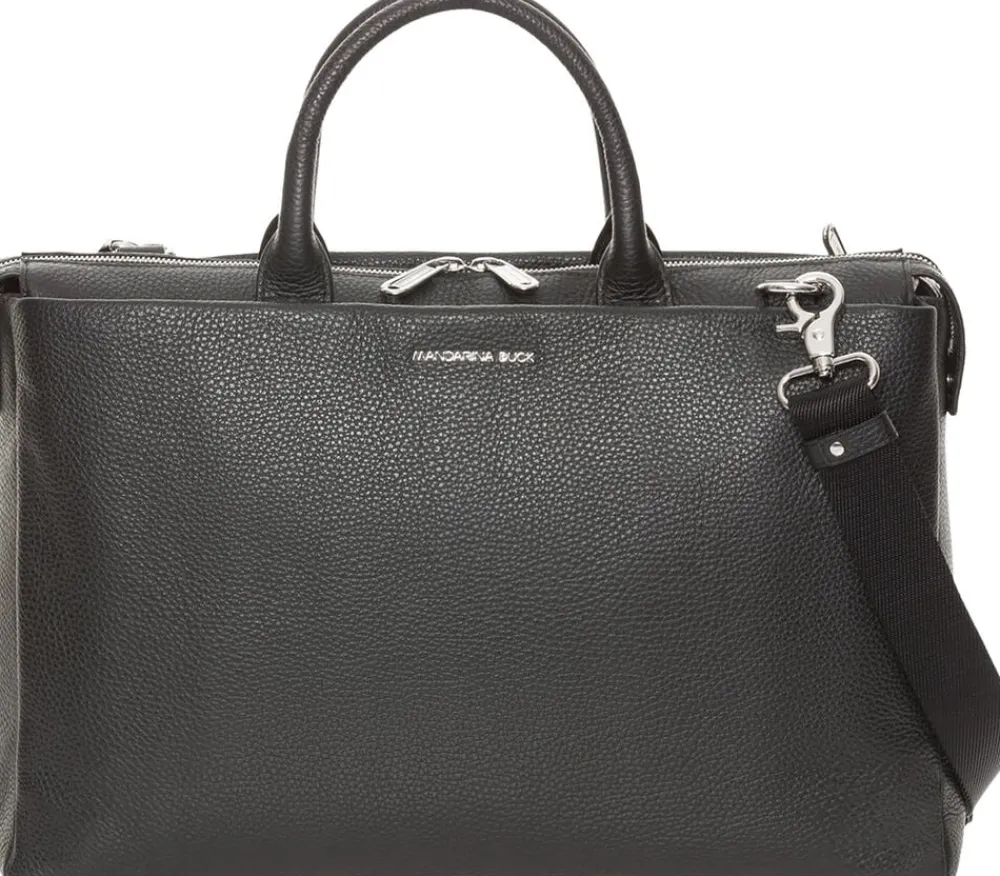 Lækker skindmappe fra den nye Mandarina Duck serie, Mellow Urban. Mappen lukkes med lynlås og indvendigt er der vatteret rum med plads til computer eller ipad samt flere små, praktiske lommer. Udvendigt er er desuden to lynlåsrum – ét på hver side. Tasken bæres i skindhankene, men der medfølger også aftagelig, justerbar skulderrem.