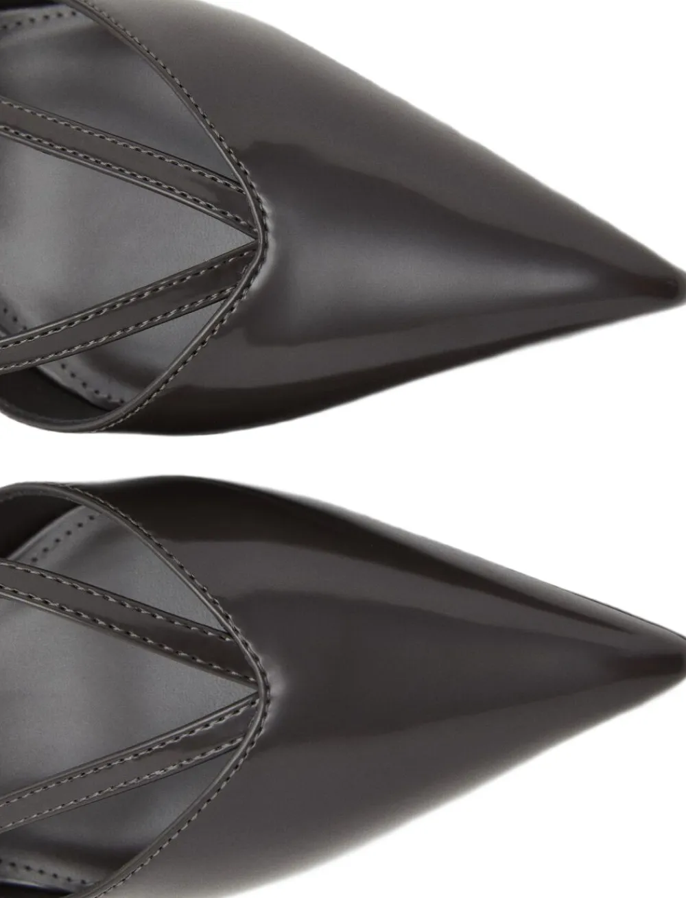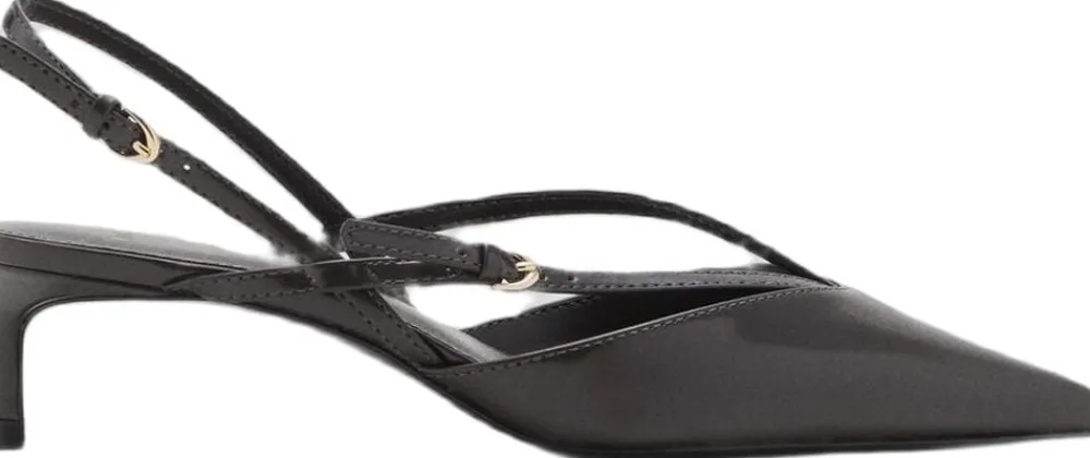 Effekt i patentlæder, Design stropper, spids, dekorativt spænde, kitten-hæl, spændelukning ved anklen, 5 cm hæl