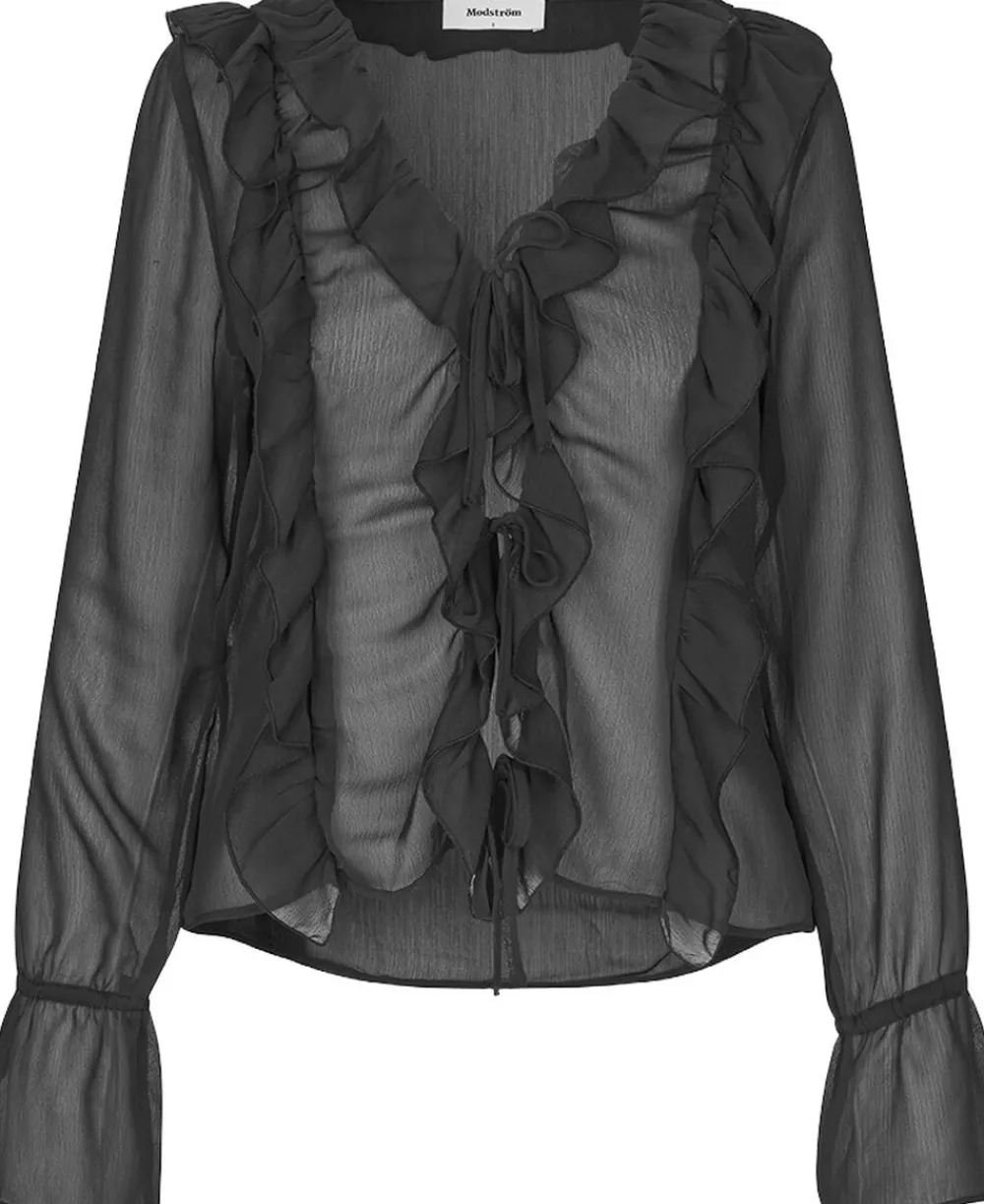 Langærmet top med en løs pasformog flæsedetaljer. NorrisMD top har en v-udskæring og brede ærmer med bindebånd. Toppen er lavet i et let og gennemsigtig materiale og har foer i kroppen.