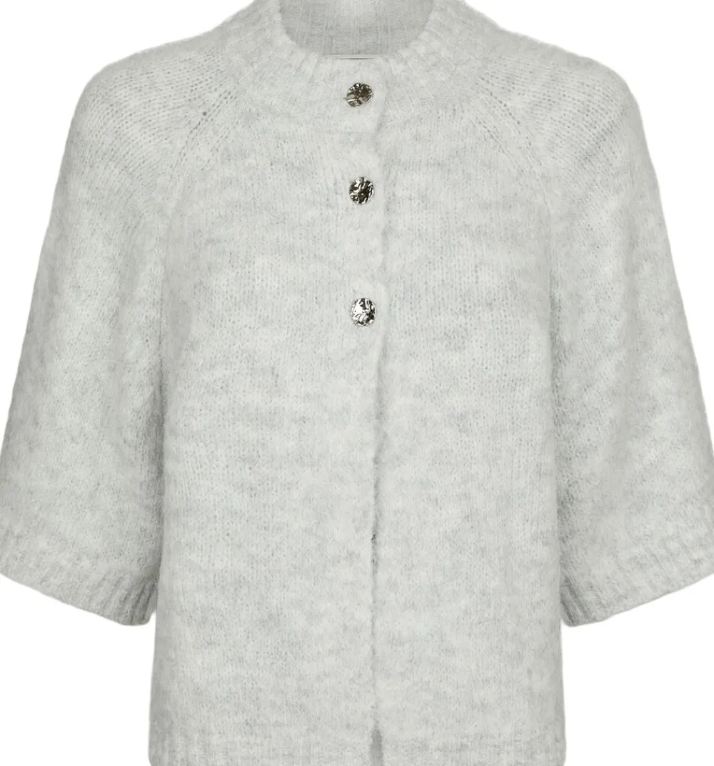 Cardigan med korte ærmer. Cardiganen har en rund halsudskæring, ærmer med vidde og en åben front med tre dekorative knapper. Den er lavet i en blød, fluffy kvalitet og har en løs pasform. Modellen er iført størrelse 36.