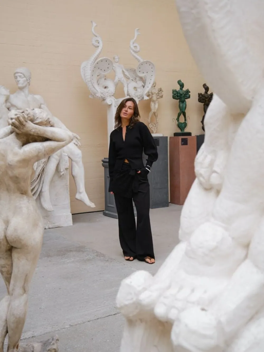 Kort cardigan med lange ærmer. Cardiganen har en rund halsudskæring, sænkede skuldre, slids foran og lukkes med knapper langs fronten. Den er designet med brede skuldre og tætsiddende talje samt ærmer, der skaber en flot silhuet. Pasformen er almindelig, og den er lavet i en ribstrikket viskoseblanding. Modellen er iført størrelse 36.