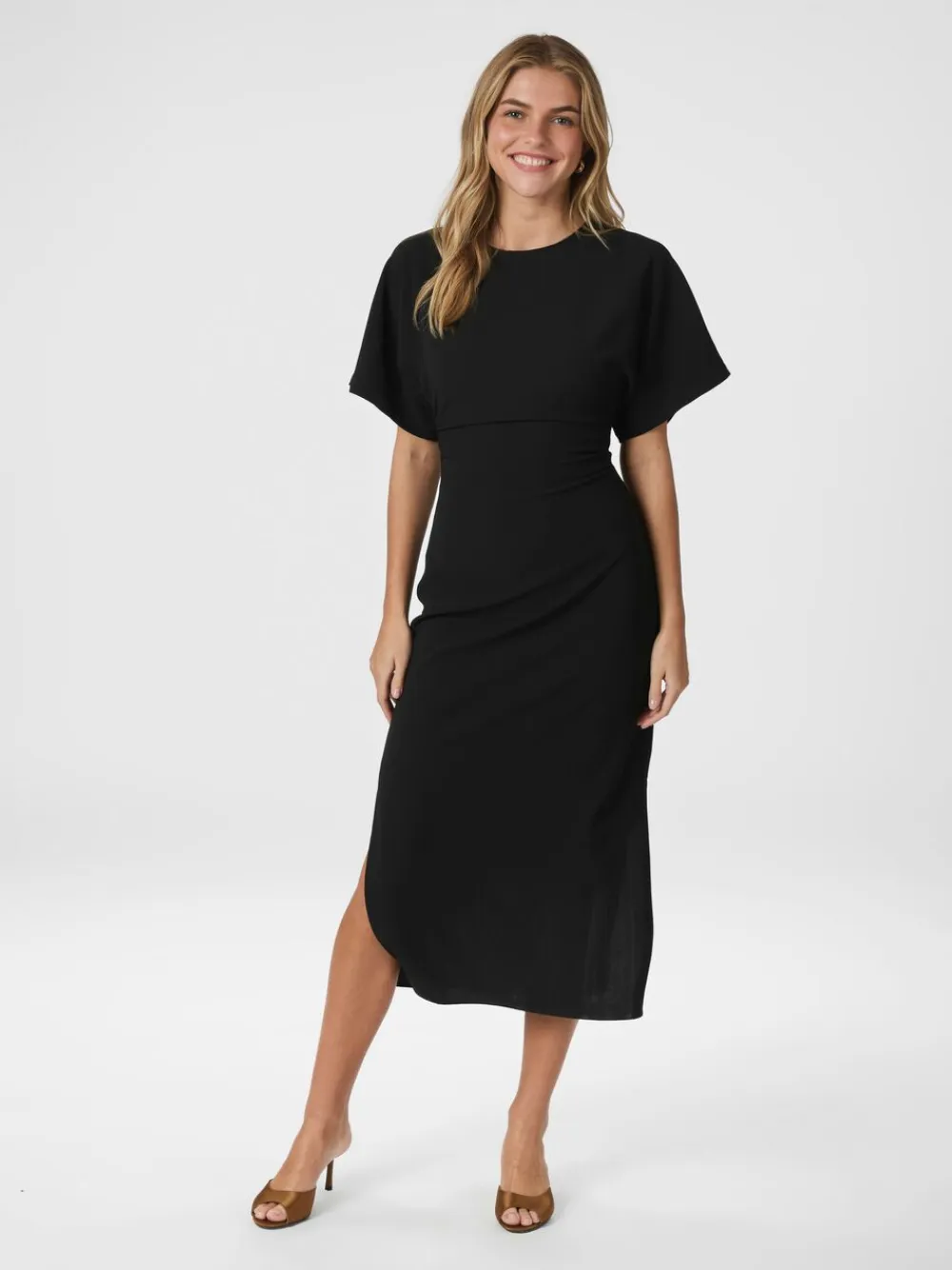 Midi kjole med slids i siden. Kjolen har en 36.rund halsudskæring, lukkes med en skjult lynlås i ryggen og har korte, brede ærmer. Den har en almindelig pasform med en tætsiddende talje. Modellen er iført størrelse 36.