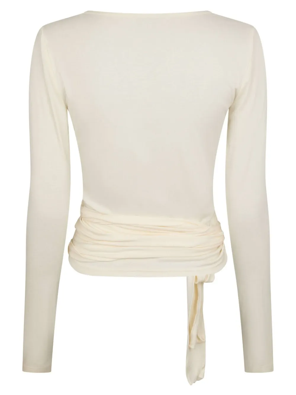Langærmet bluse med slå-om-effekt. Blusen har en v-halsudskæring, er lavet i en blød kvalitet og har en tætsiddende pasform. Den har et justerbart bindebånd, der kan bindes både foran og bagpå. Modellen er iført størrelse 36.