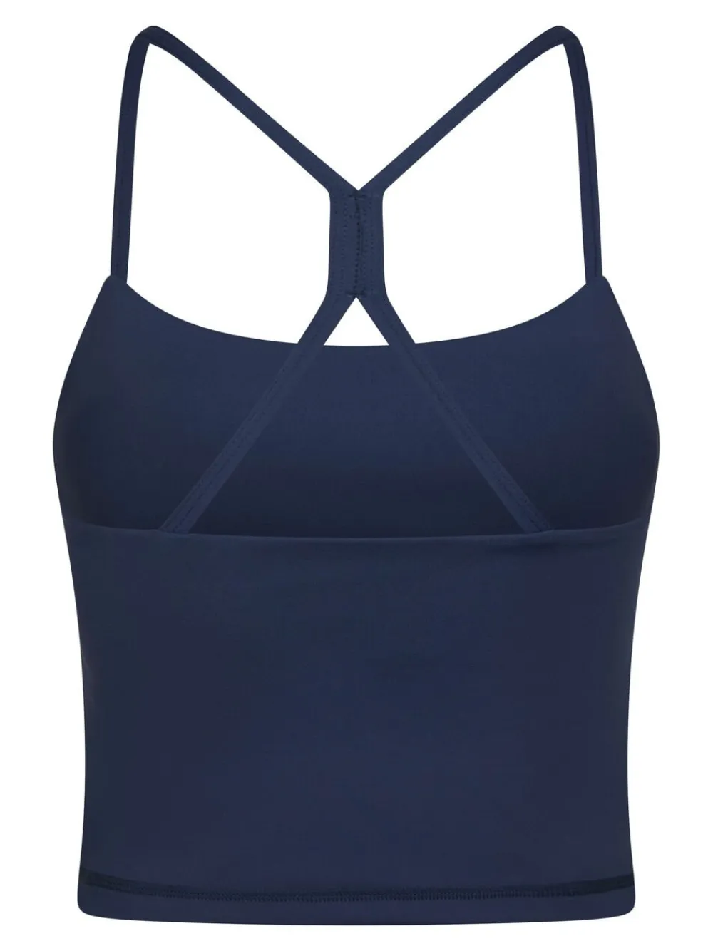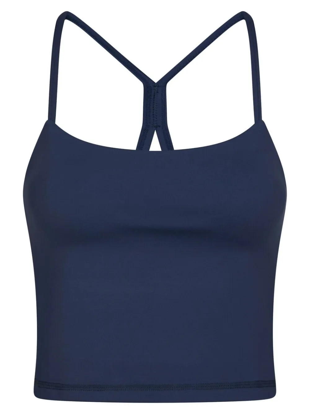 Kort top uden ærmer. Toppen har rund halsudskæring, tynde stropper, der krydser på ryggen, samt forede skåle. Den er lavet i et strækbart materiale og har en tætsiddende pasform. Modellen er iført størrelse 36.