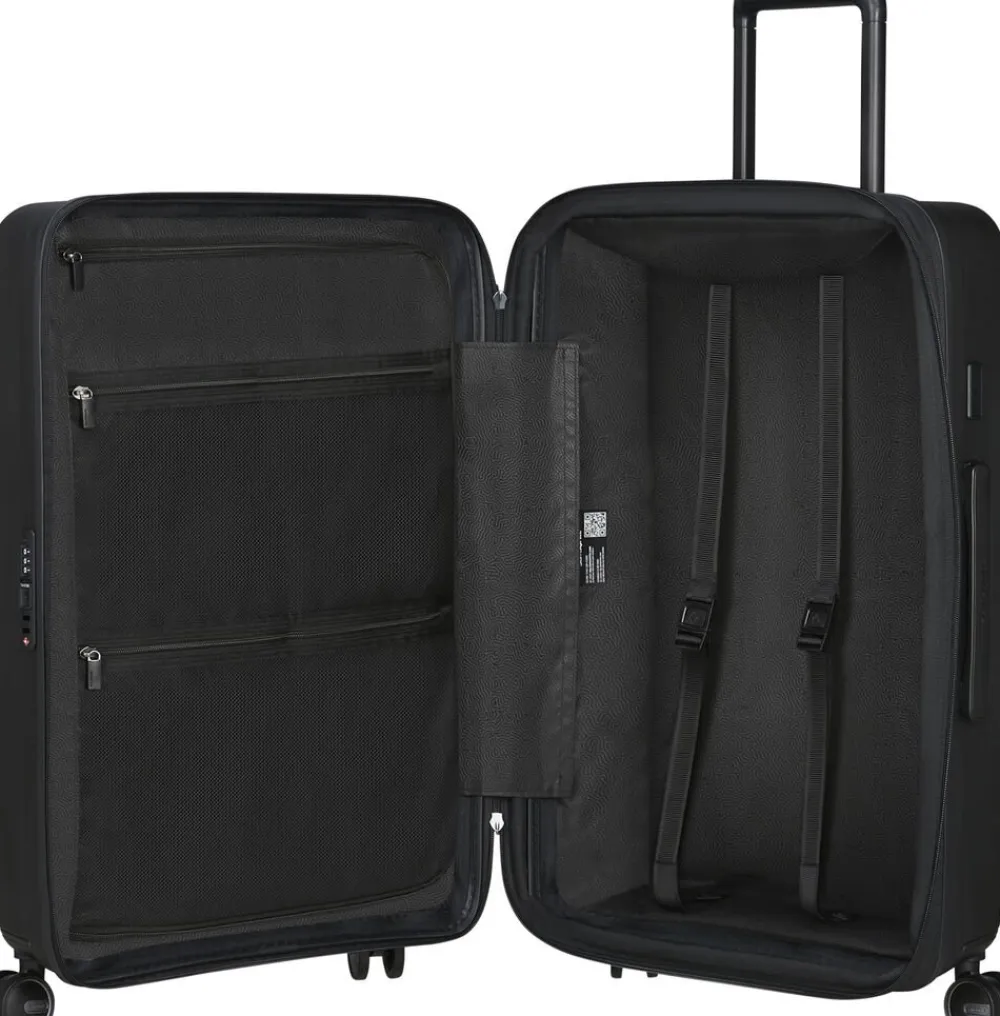 Kuffert med mulighed for udvidelse,indeholder 2 pakkeposer, mulighede for personalisering med de medfølgende stickers, polypropylen,4 hjul,TSA lås , indvendig stofforring lavet af genbrugte plastflasker, dobbelt trollystativ,navneskilt, vægt 3,4 kg,rumindhold 71/79l, 5 års garanti,68x46x26/29 cm.