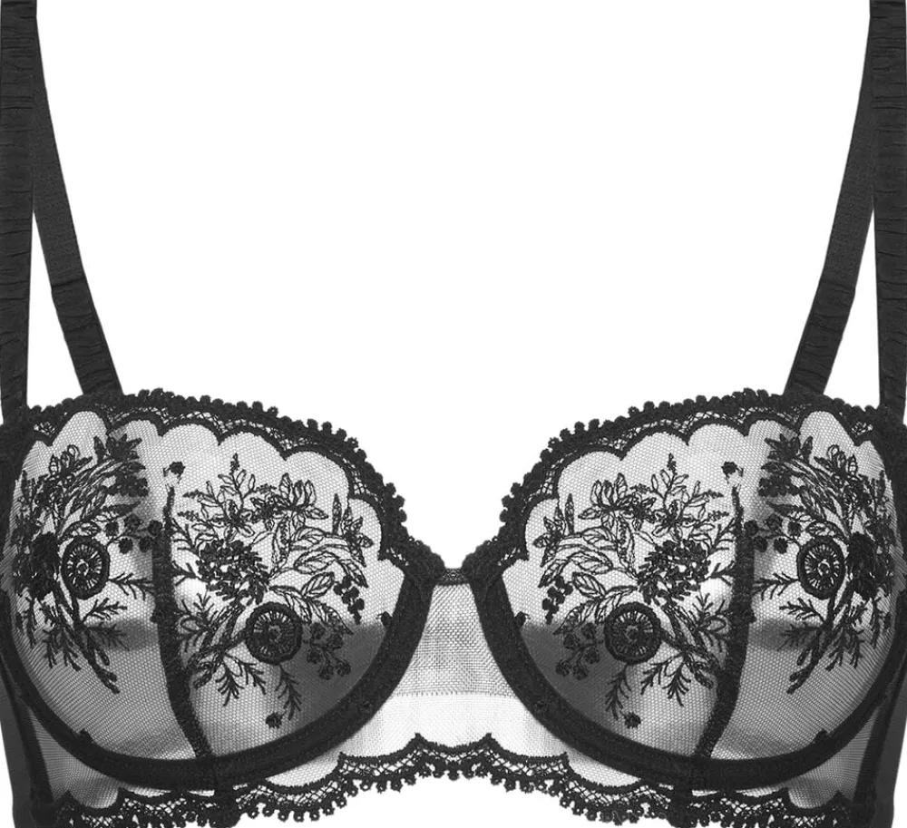 Undertrådet halvkop-bh i Recycled broderi. Perfekt til en afrundet form og en løftet buste. Lige halsudskæring fremhævet med scalloped broderi. Kopper i broderi med lodrette dartstykker. Bredt underbust bånd i gennemsigtig tulle med scalloped broderi, minibustier-effekt