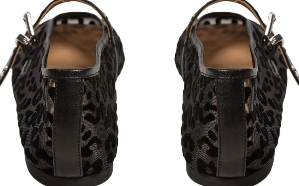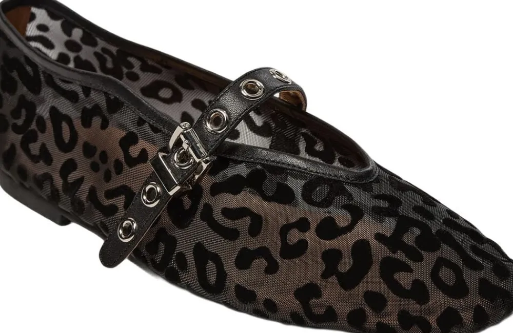 • Elegant ballerina i mesh og læder • Gennemsigtig med sort leopard i fløjl • Rund tå • Justerbar rem med nittedetaljer