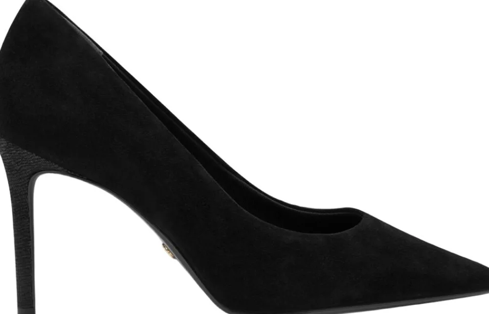 Spids sort pump i ruskinds look med præget flot stilet hæl på 90 mm. Skind foeret og med Touch it effekt i dæksålen