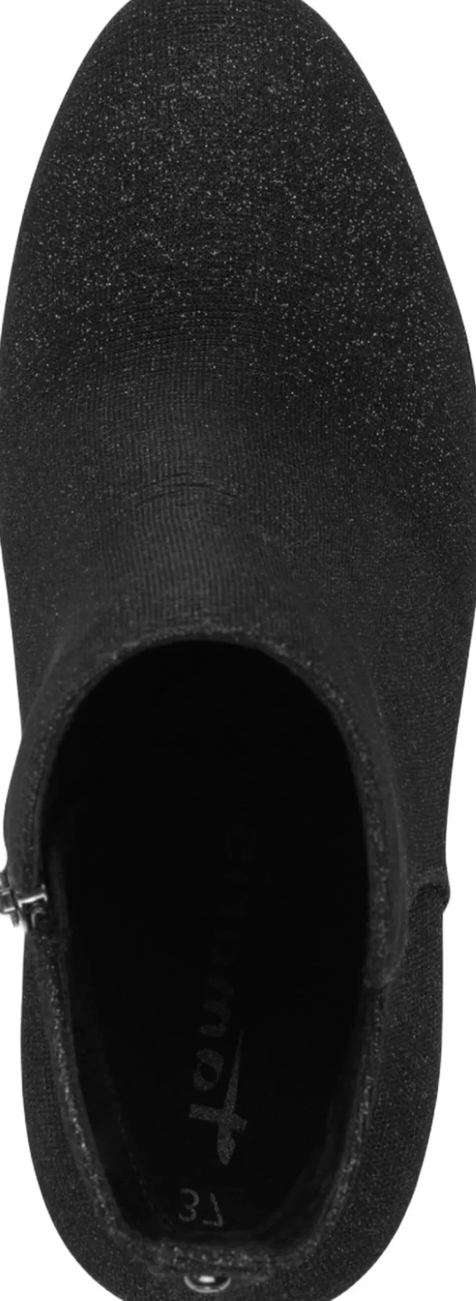 Kort let støvle i sort glitter tekstil materiale. Blokhæl på 80mm skafthøjde på 10 cm. Indvendig lynlås og der er antislide og antichok i hælen samt Touch it effekt i dæksålen