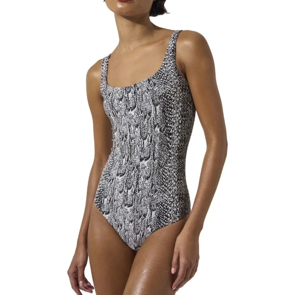 Denne bodysuit uden ærmer har et monokromt pythonmotiv, der ikke går glip afde matchende leggings fra kollektionen. Den balancerer kreativitet og innovation og er fremstillet af bæredygtigt farvet Emana-garn – en revolutionerende fiber, der absorberer varme fra Krop og returnerer den som infra
