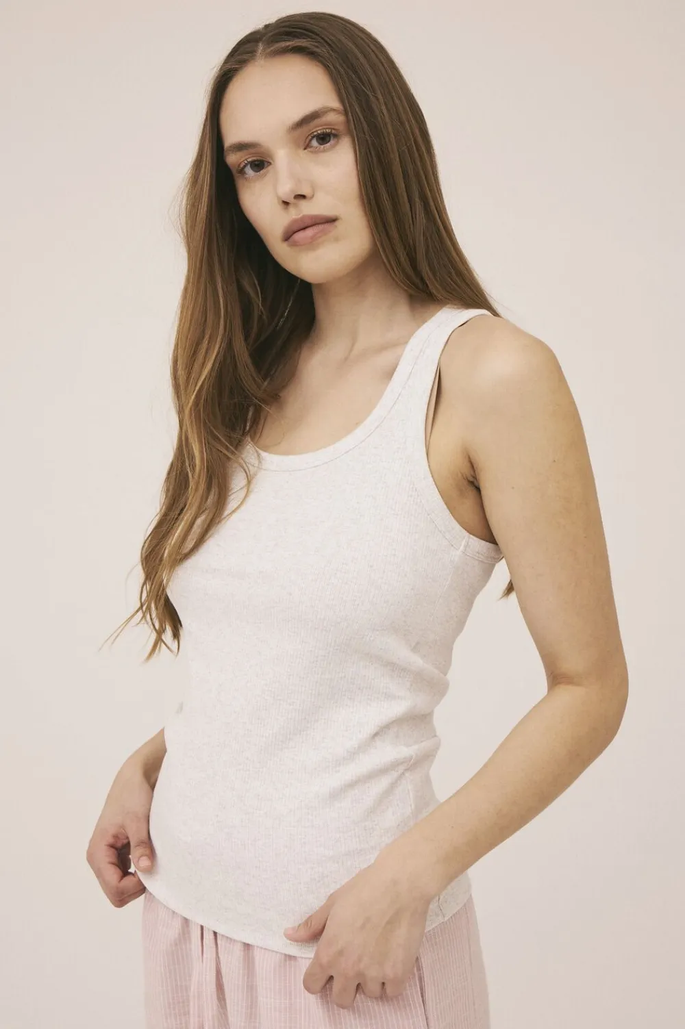 Tanktop fra Magasin du Nord Collection i den blødeste kvalitet af 93% økologisk bomuld med GOTS-certificering. Toppen har en ribstrikket struktur, der giver en skøn, tætsiddende pasform, en rund halsudskæring samt brede skulderstropper med bryderryg. En casual tanktop, der er et musthave i basisgarderoben.