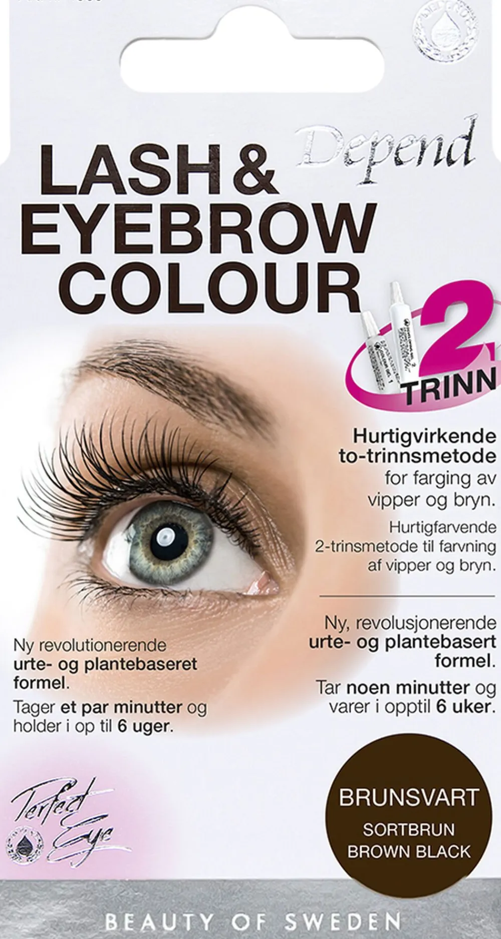Få friske øjne uden makeup med Depend Lash & Eyebrow Colour. Dine øjne er altid naturligt markerede – lige fra morgenstunden, når du dyrker sport, soler dig eller bader. Lash & Eyebrow Colour har en ny og revolutionerende urte- og plantebaseret formel og indeholder bl.a. røllike, morgenfrue, grøn te og blåbær. Denne unikke sammensætning er blevet til et produkt, som er vandfast, skånsomt at anvende, nemt og hurtigt at påføre, og som giver en intensiv farve, der holder længe. Dette giver også et indtryk af længere vipper og mere markerede bryn. Behandlingen tager kun nogle minutter, og resultatet holder i op til 6 uger. Indholdet i pakningen rækker til 5-7 behandlinger. Fås i farverne sort, sortbrun, mørkebrun og brun.