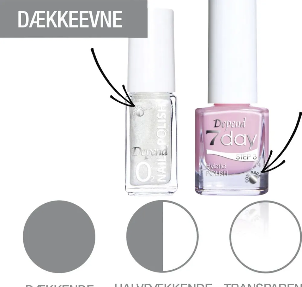 O2 har en patenteret formel, som bevirker, at der bedre kan trænge ilt igennem til neglen, hvilket har en positiv indvirkning på neglens kvalitet. Denne lak slipper 30 % mere ilt igennem end en almindelig neglelak. Depend O2 neglelak indeholder ikke toluen, formaldehyd og DBP (dibutylphthalat).