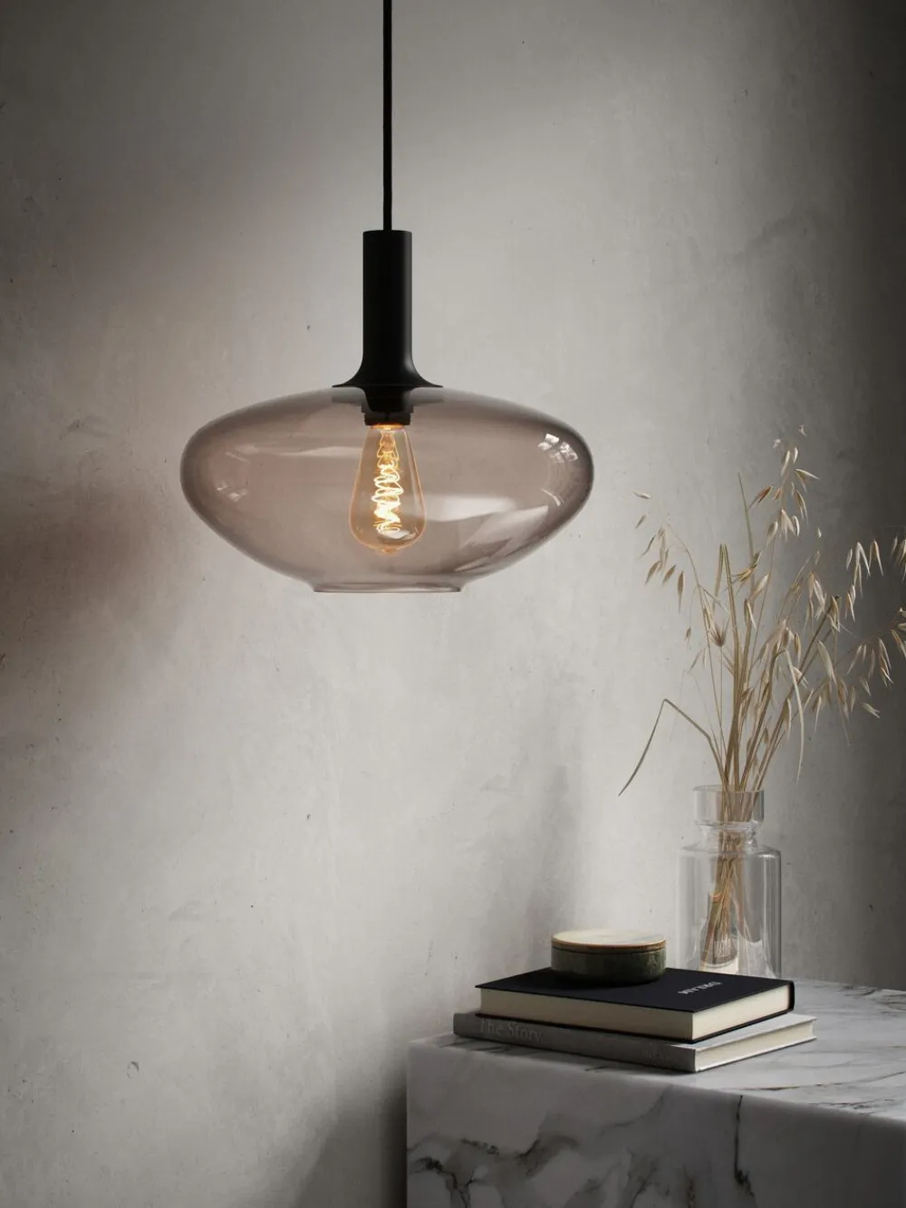 Dekorativ E27 Edison-pære i ravfarvet og med en croissantformet lyskilde. Det varme hvide lys skaber en hyggelig stemning.