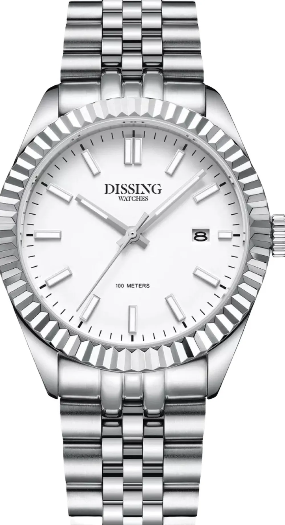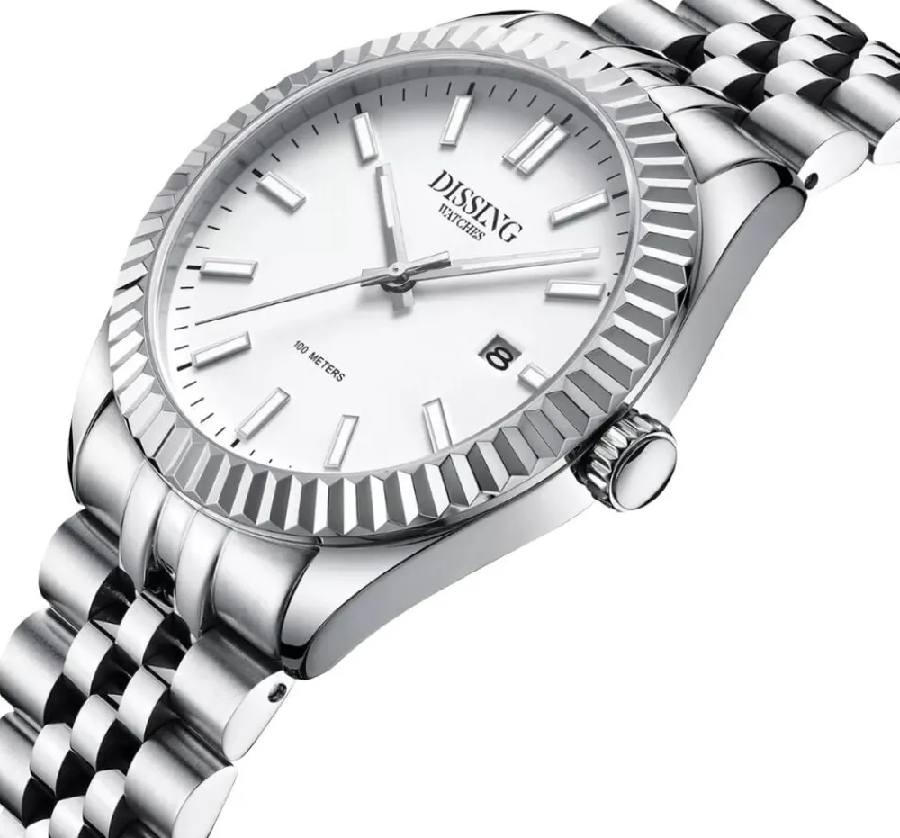 Dissing Date D1209 uret kombinerer tidløst design med moderne funktionalitet. Det har en klassisk rund urkasse med en karakteristisk rillet bezel, der tilføjer tekstur til designet. Uret har en diameter på 41 mm, hvilket gør det til et bemærkelsesværdigt tilbehør på håndleddet. Dets hvide urskive er suppleret med slanke timemarkører og visere, der giver et rent og enkelt udseende. Stål-lænken, sammensat af sammenkoblede segmenter, giver både stil og komfort. Uret er udstyret med kvarts urværk drevet af Miyota 2315 kaliber.
