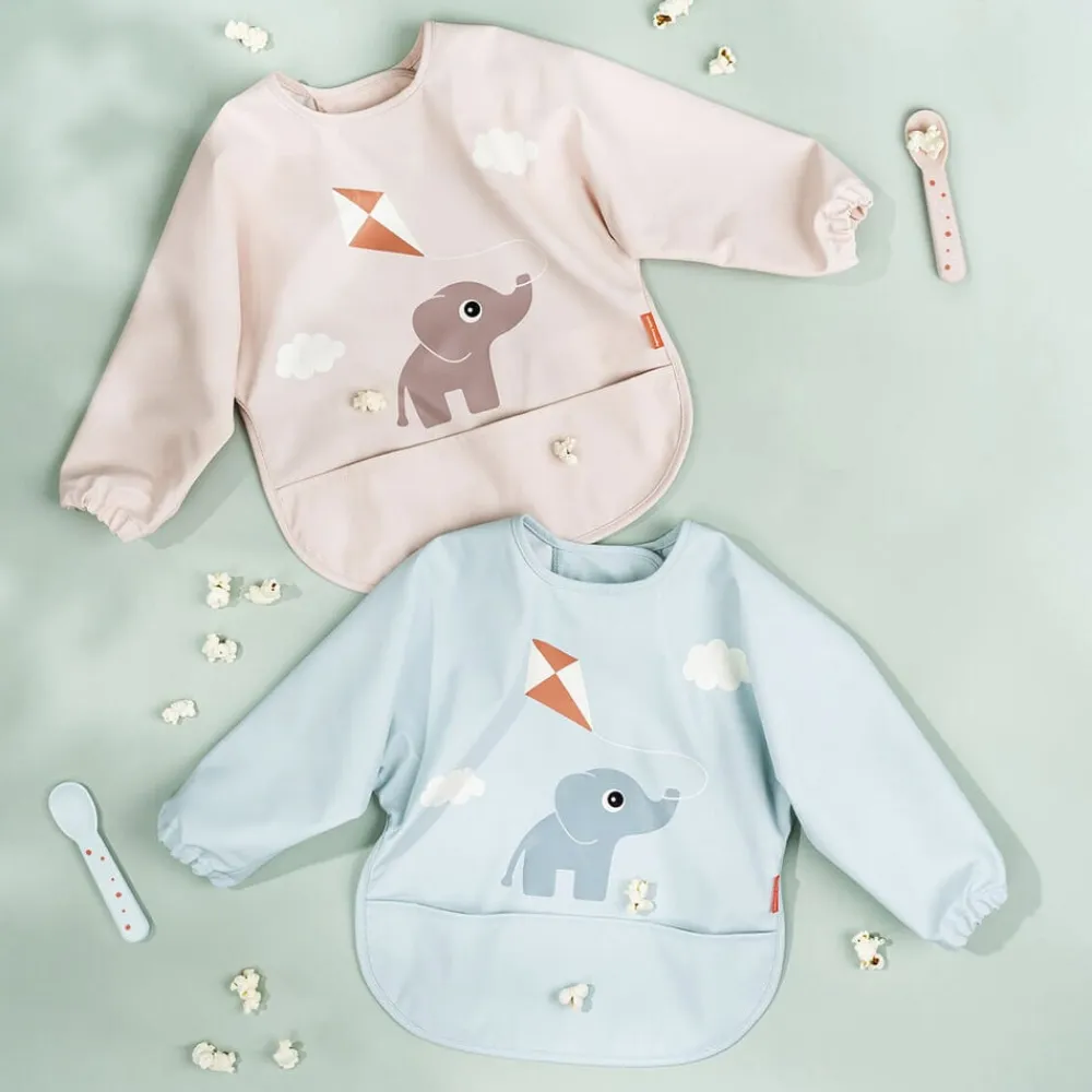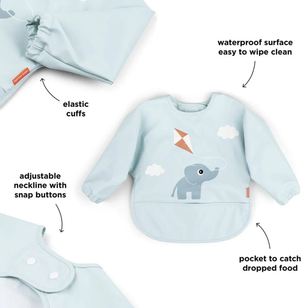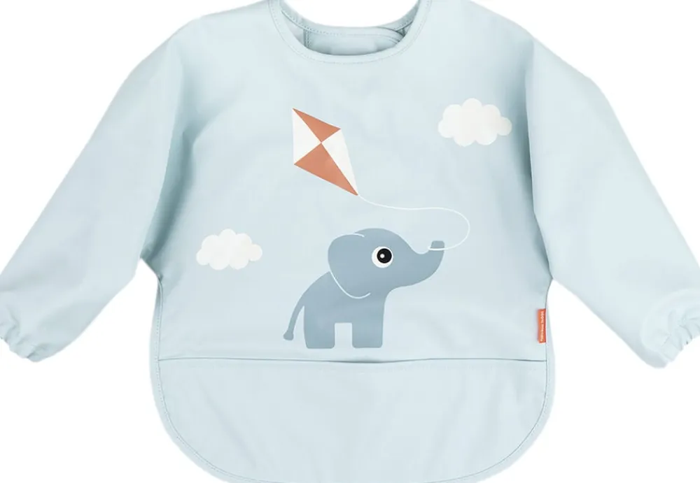 Fin, blå hagesmæk med motiv af Elphee, der flyver med drage