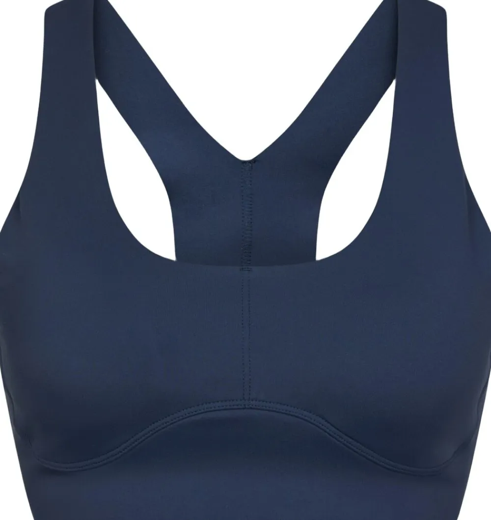 Kort sportstop. Toppen har rund halsudskæring, racerback-design og dekorative syninger. Den har brede stropper, som giver god støtte under aktivitet. Pasformen er tætsiddende, og den er fremstillet i et strækbart materiale. Modellen bærer størrelse 36.