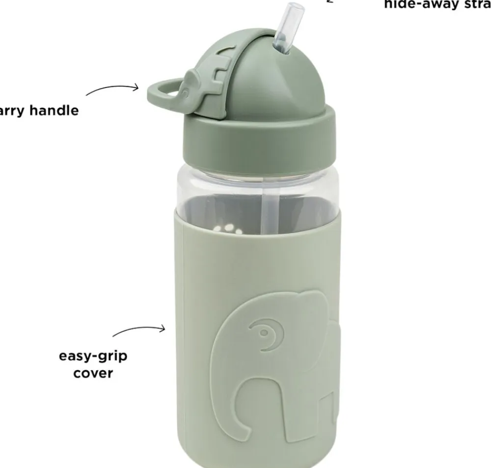 Den søde drikkedunk med sugerør og et easy-grip omslag passer perfekt i ungernes rygsæk. Drikkeflasken har et smart sugerør, der kan gemmes i låget og forhindrer at væske spildes. Håndtaget hjælper de små hænder til at finde sugerøret frem igen. Den spildfrie børne-drikkeflaske er uundværlig på farten og gør det sjovt for barnet at drikke masser af vand. Silikone-omslaget sikrer et godt greb og et ekstra sugerør samt mundstykke er inkluderet. Silikone-omslaget er præget med Elphee og grønne toner pryder vandflasken.