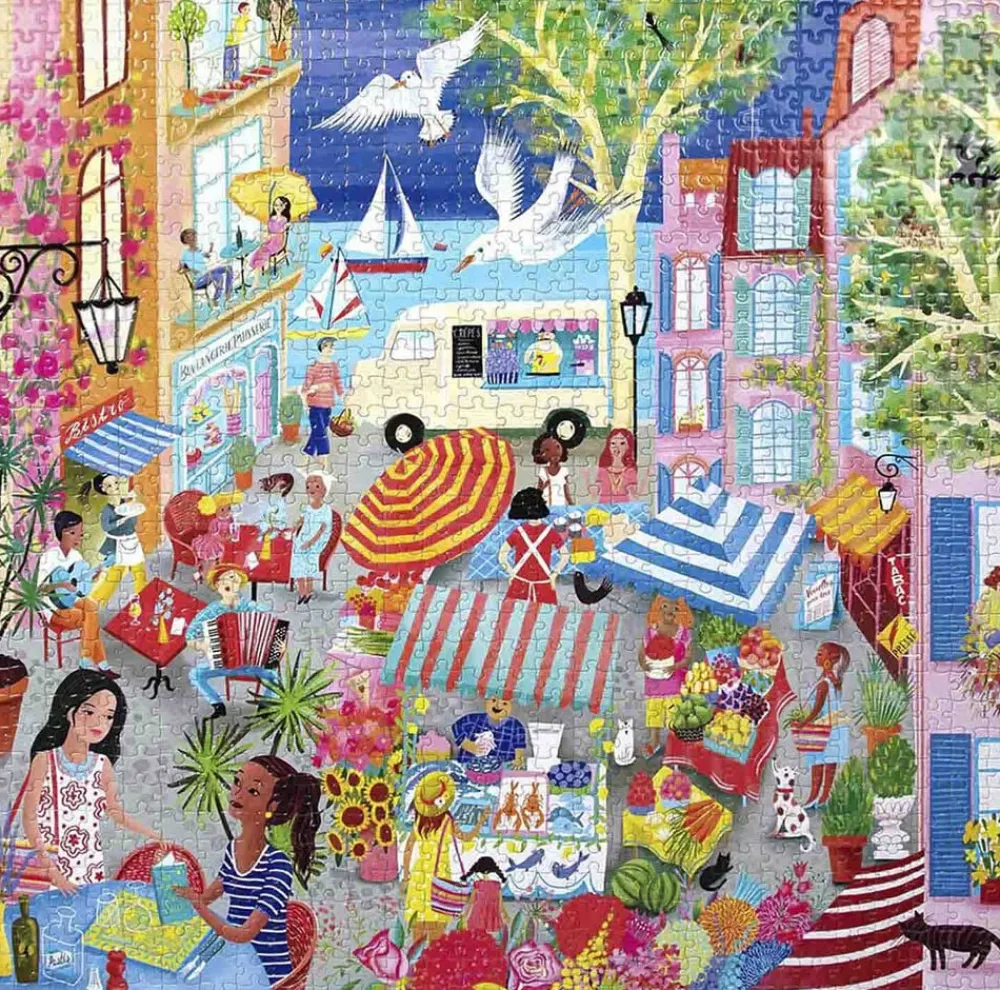 Et lokalt marked i en kystby et sted i Frankrig, travlt med farver, musik og aktiviteter.