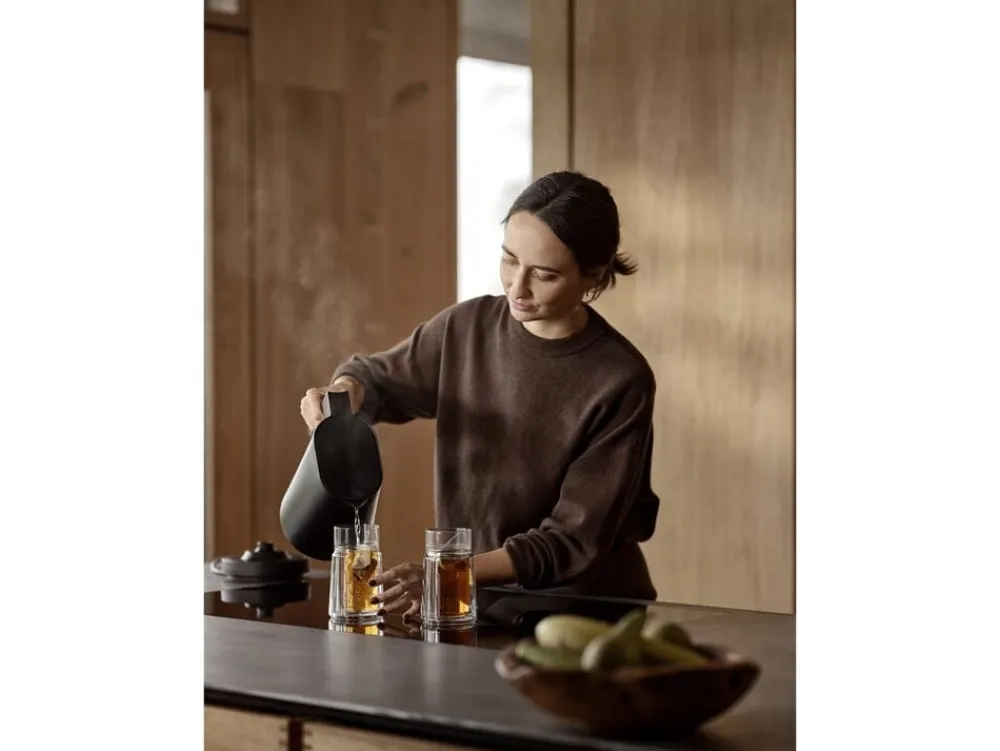 Jacob Jensen elkedel sætter en ny standard for dit behov for varmt vand. Den er fremstillet af gedigne materialer og med en stille elegance, hvor interfacet kommer til live, når din hånd nærmer sig, og slukker igen, når det ikke længere er nødvendigt. Den solide, men alligevel bløde fornemmelse af håndtaget i støbt aluminium giver optimal kontrol, når du løfter kedlen, og sikrer en behagelig hældning, hver gang. Kapaciteten er 1,2 liter, og elkedlen har 5 forudindstillede temperaturer, digitalt display og touch-kontrol, solid metalkrop og håndtag i støbt aluminium.