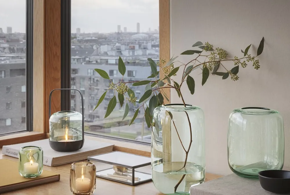 Lad hyggen sprede sig både inde og ude med den elegante og dekorative Acorn lanterne. Med sit praktiske greb i pulverlakeret stål er lanternen lige til at tage med sig, f.eks. ud på terrassen. Glassets sarte Mint-nuance er inspireret af den rå natur omkring os. Lanternen tændes nemt ved blot at løfte glasset og passer til fyrfadslys i standardstørrelse.