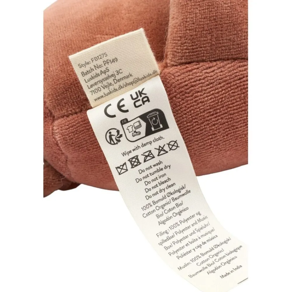 Sød og blød Fabbie Music Box – Bunny til stille stunder med en fin lille melodi, så dit lille barn kan få et afslappende øjeblik. Kaninen holder et musselin stof, der er lavet af 100% økologisk bomuld og perfekt til dit barn at putte med. EU Legetøjsikkerhedsstandard – CE Aldersanbefaling 0m+