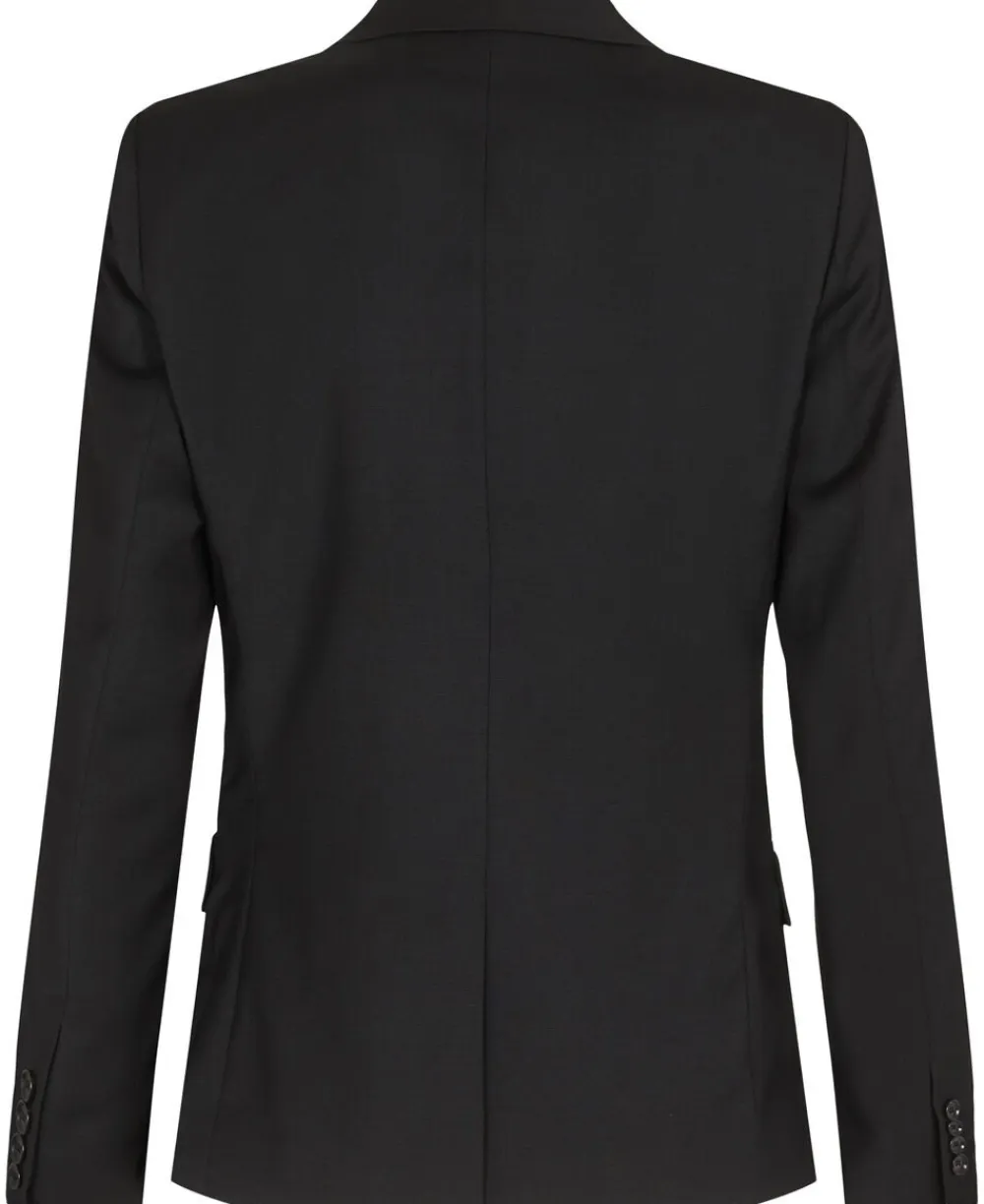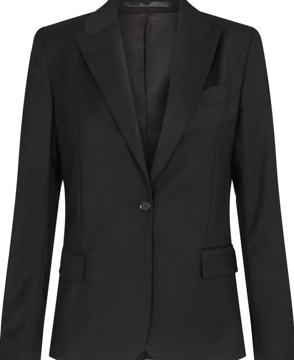Single blazer i uldblanding med stræk. Single ryg ve nt, peaklapel, knappet ærmeåbning, vinklet brystlomme og to klaplommer. Fuldt foret.