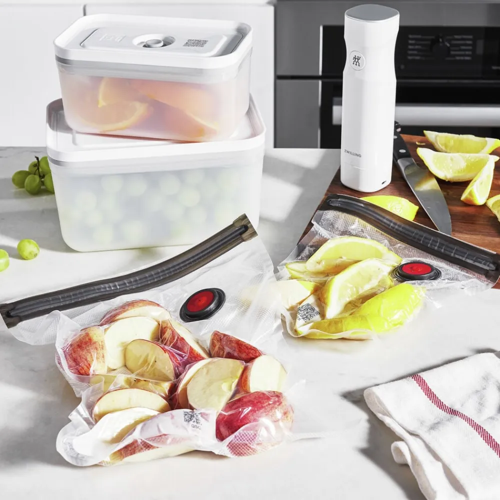 ZWILLING FRESH & SAVE er et vakuumopbevaringssystem, der holder maden frisk op til 5x længere. Opbevaringssystemet bibeholder vigtige næringsstoffer og vitaminer i den opbevarede mad. Nu har du muligheden for at komme i gang med at foodpreppe, minimere madspild, og i det hele taget at optimere måden at gemme råvarer på. Sættet består af 7 dele: 1 vakuumpumpe inkl. USB kabel til opladning af pumpen, 2 stk. vakuumposer i str. S (1,25 L, mål: 23×20 cm) og 2 stk. vakuumposer i str. M (4 L, mål 35 x 25 cm), 1 stk. 0,9 L vakuumbeholder i glas samt 1 stk. 2 L vakuumbeholder i glas. Beholderen må ikke fyldes helt op, da der skal være luft i beholderen for at kunne skabe vakuum. Vakuumbeholderne i glas kan gå i opvaskemaskinen, mikrobølgeovnen, ovnen op til 180 °C, køleskabet og fryseren. Vakuumposerne kan også gå i mikrobølgeovnen og fryseren og er derudover varmebestandige op til 100° C, hvilket gør dem ideelle til sous vide. Vakuumbeholdere i glas: SOvnfaste uden låg op til 180 °CBeholdere og poser: Fryseegnet indtil -20,00 °CBeholdere og poser kan gå i mikrobølgeovnOpvaskemaskine: Kun beholdere, poser og pumpe vaskes i håndenMaterialer: Borosilikatglas (beholder), BPA fri plast (låg), silikone (ventil, tætning), kunststof (vakuumpose)Vakuumlåg med innovativ dobbelt forseglingsteknologiEnkel registrering med den gratis app der vha. QR koden holder styr på holdbarhed og indholdUSB kabel til opladning af pumpen medfølgerForhindrer frostskader på madvarerHolder mad friskere i op til 5 gange længere sammenlignet med andre opbevaringsmetoder uden brug af vakuum. Vakuumopbevaring bibeholder vigtige vitaminer samt næringsstoffer i den opbevarede mad.