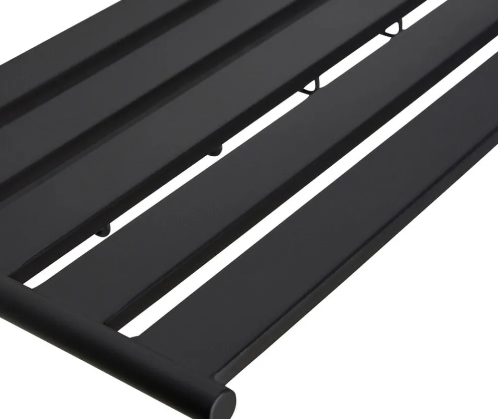 Sort hattehylde med knagerække i pulverlakeret metal.