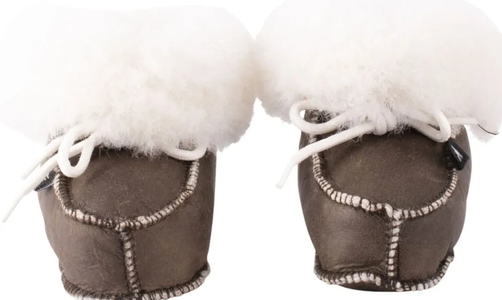 Shepherd Gävle et par behagelige og varme babysutsko i fåreskind. Sutskoene er udformet i en ankelhøj model med en bred foldet kant i fåreskind. De har snørelukning, hvilket gør, at de sidder godt og er lette at tage af og på. Blød sål i ruskind.