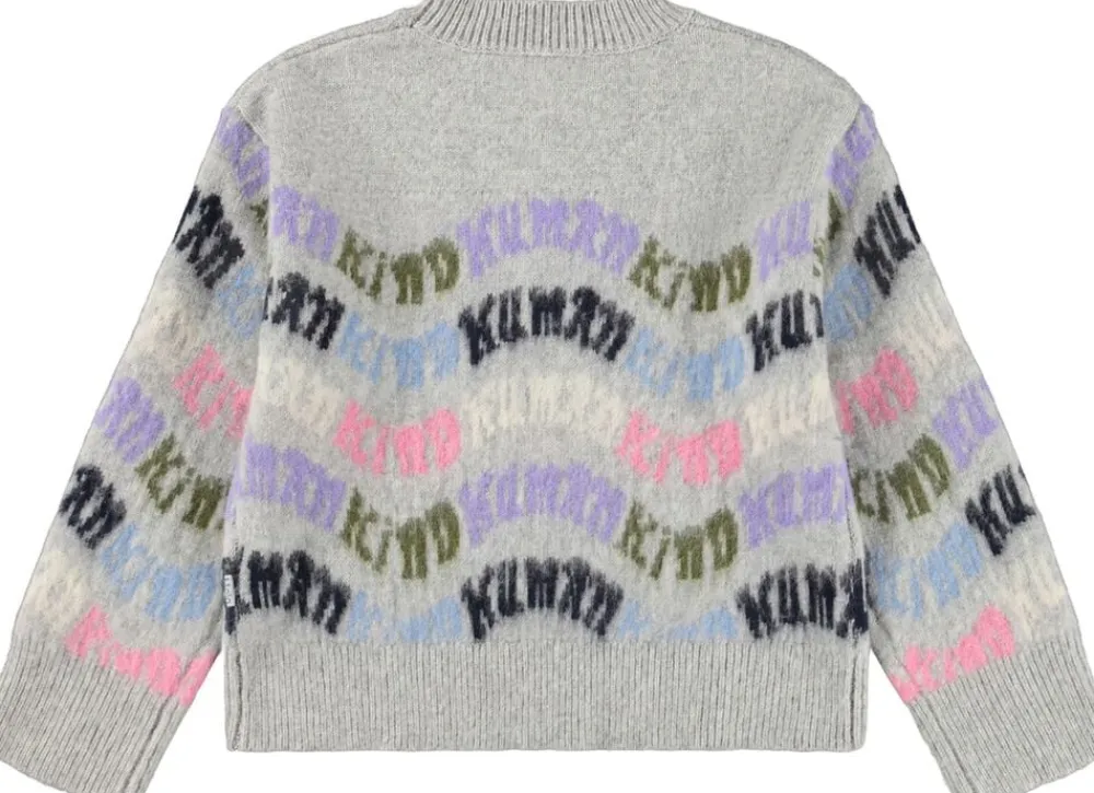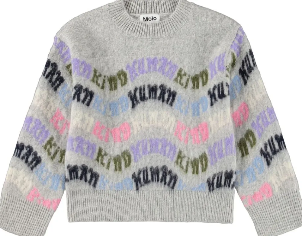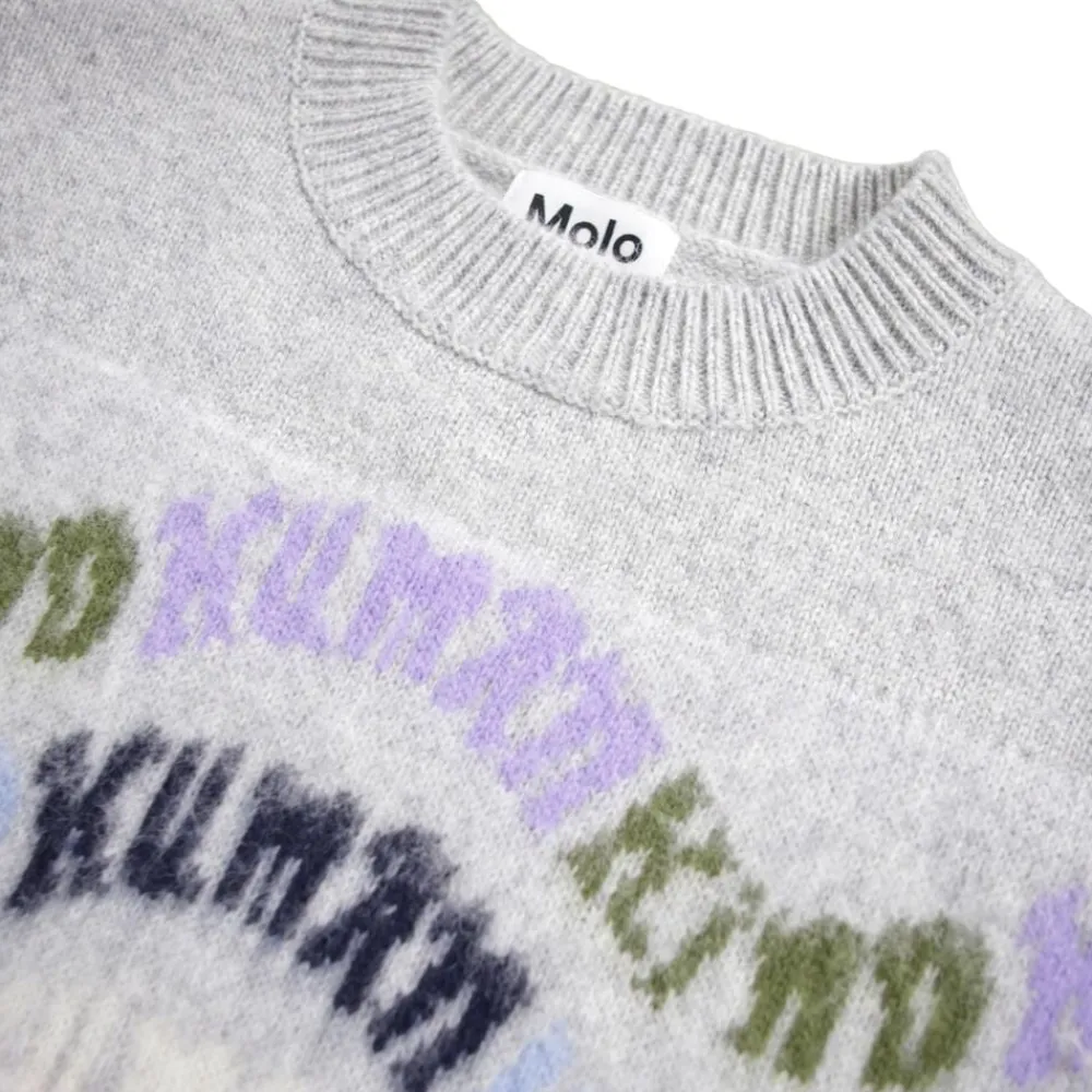 Denne grå lette oversize sweater i uld fra Molo har et multifarvet mønster med teksten ‘Humankind’ vævet rundt om. Sweateren har en løs pasform og ribkanter ved udskæring, ærmer og bund.